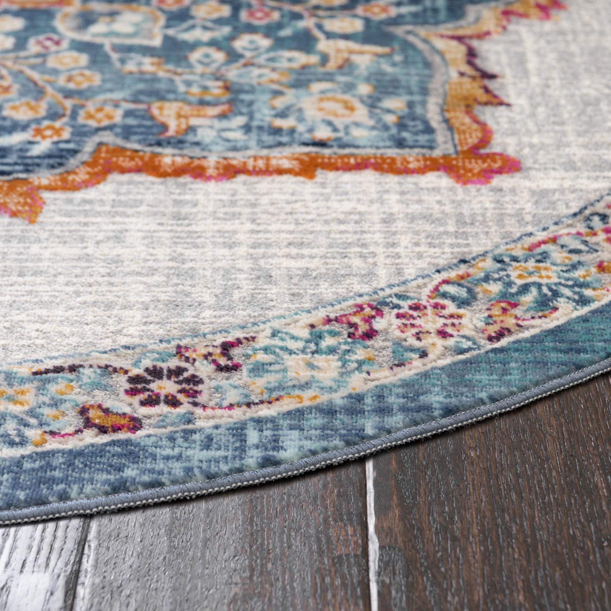 A traditional medallion motif is woven with crisp, floral detailing and a narrow patterned border that gives the round shape a balanced, finished look. The background is blue, while navy blue and gray form the deeper contrasts of the central medallion. Gold and yellow highlights punctuate the design, with touches of orange and pink adding warmth and ivory accents that lift the pattern. Machine-made construction blends 70% polypropylene and 30% polyester, yielding a low-profile, soft pile with a smooth, slightly lustrous surface that feels comfortable underfoot and holds the pattern definition clearly.