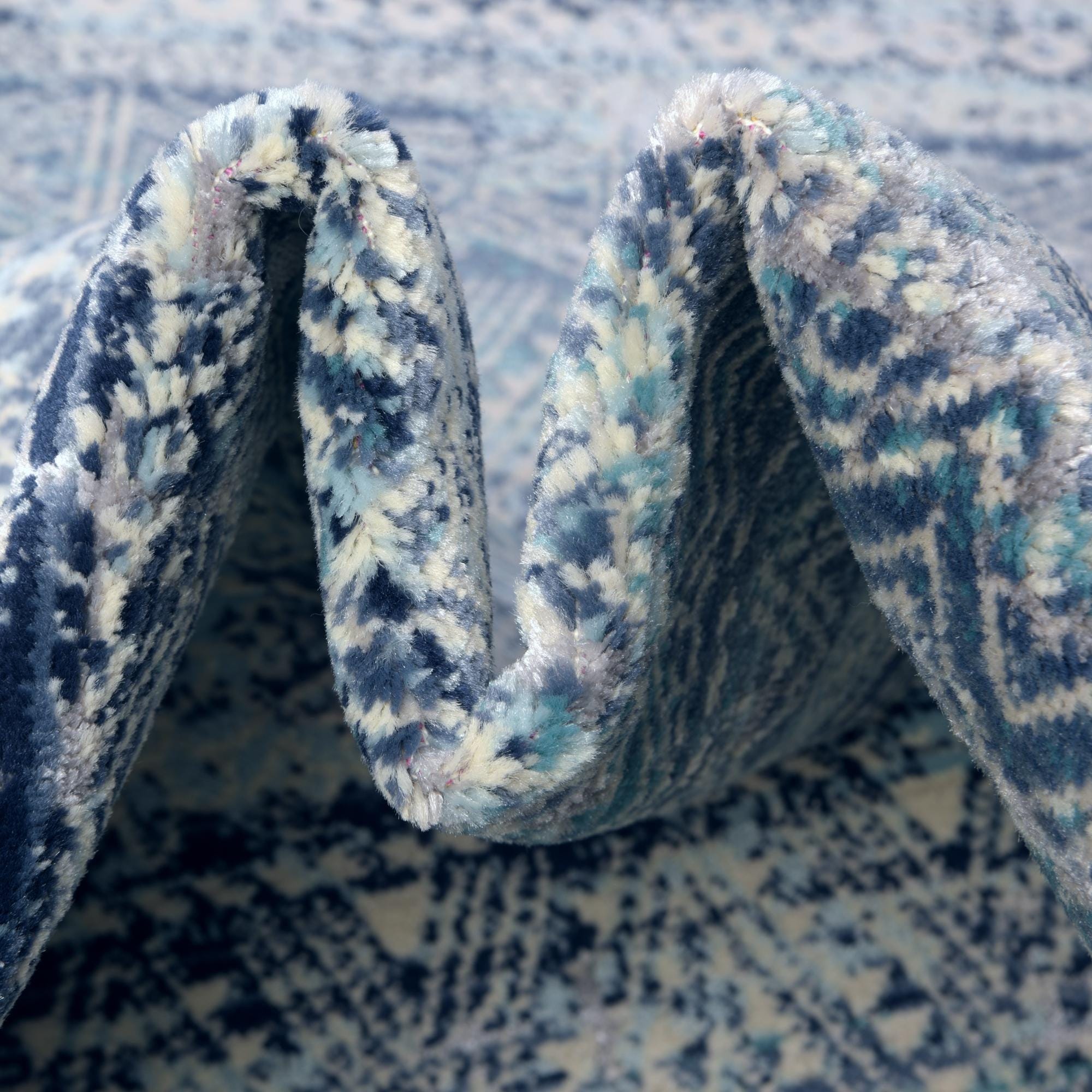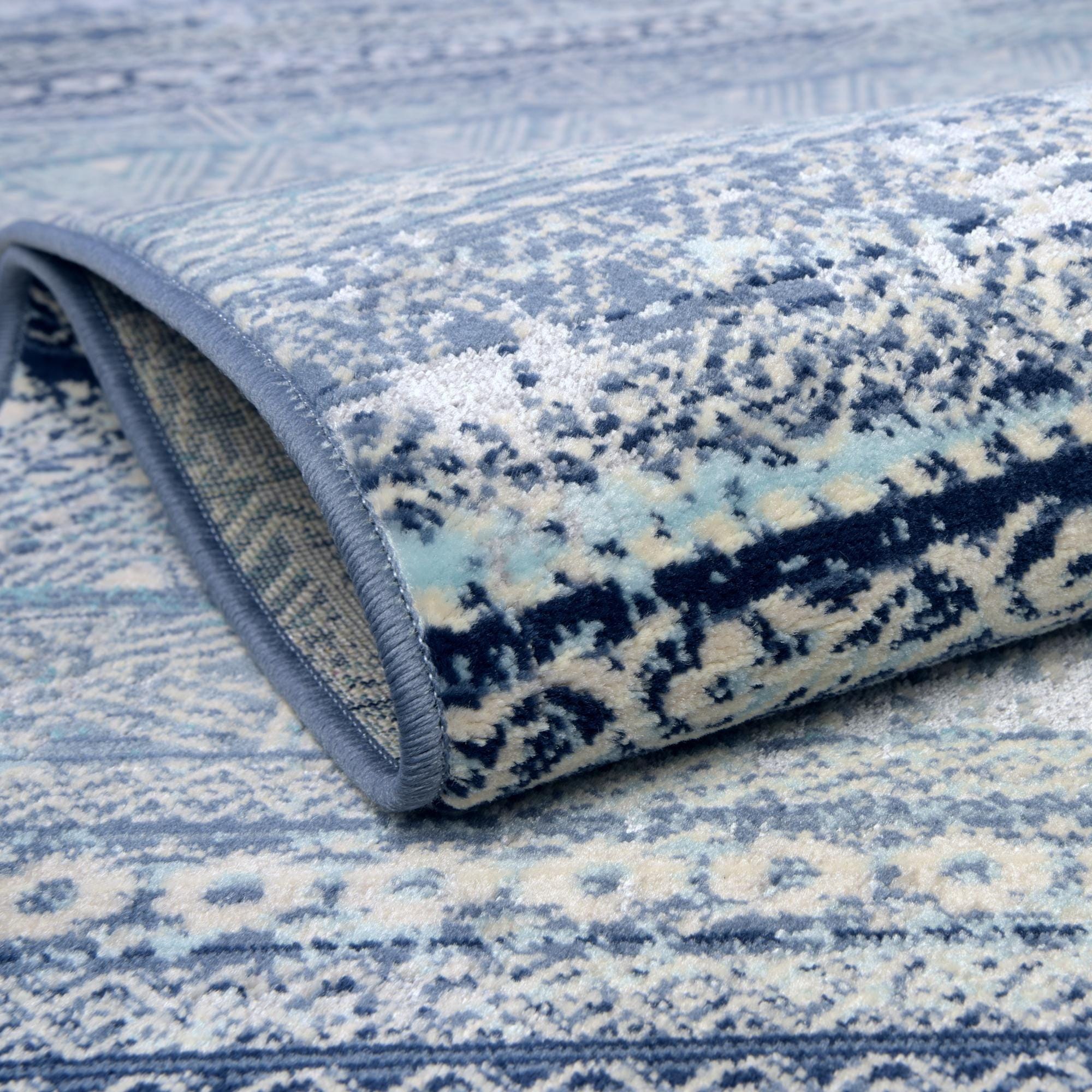 Primary color is Blue. Colors in this rug include: Blue, Ivory, Navy Blue, Light Blue.