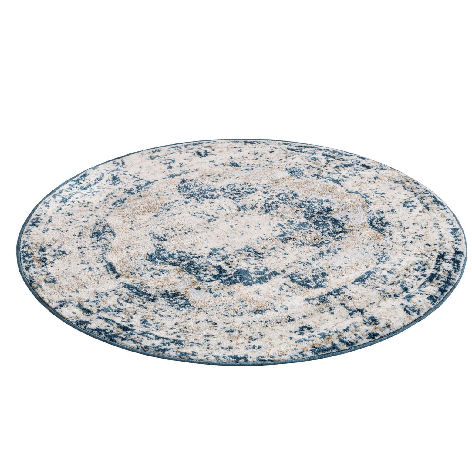 A softly distressed medallion pattern gives this round rug a relaxed, vintage-inspired character. The blue background anchors the design while ivory, beige and light blue accents create a mottled, painterly effect across the field and central motif. The irregular speckling and worn edges read like an antique piece updated for modern spaces, offering visual texture without heavy ornamentation.