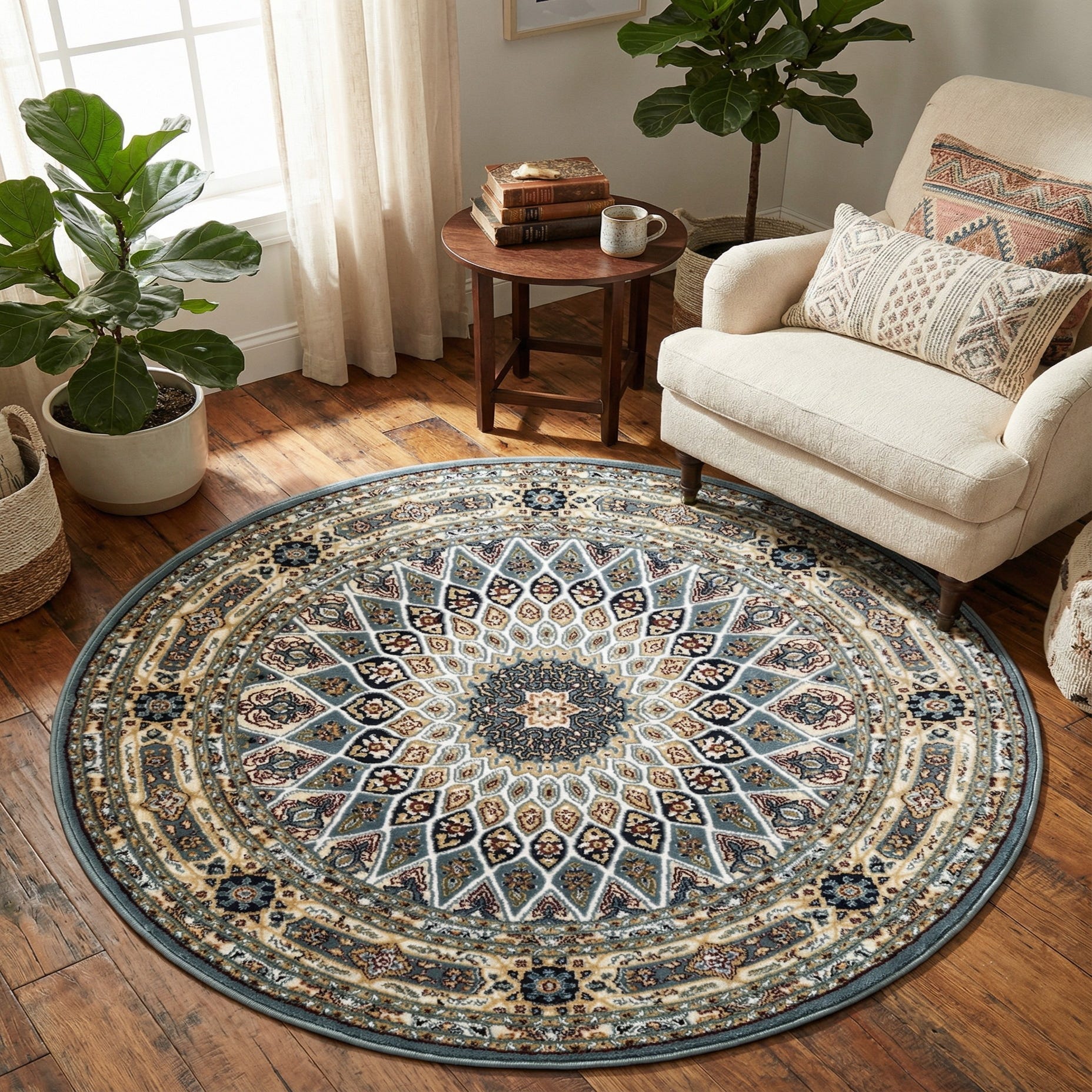 Machine made from 85% polypropylene and 15% polyester, the pile has a soft, low-to-medium nap with a gentle sheen from the polyester highlights. It feels smooth underfoot and holds its pattern definition well. The round shape works beautifully beneath a small dining or bistro table, as an anchor for a cozy reading nook or entry area, or layered in a living space to define a seating grouping. Pair it with warm wood tones, navy or cream upholstery and brass or matte-black accents for a balanced, layered look that blends traditional character with transitional furnishings.