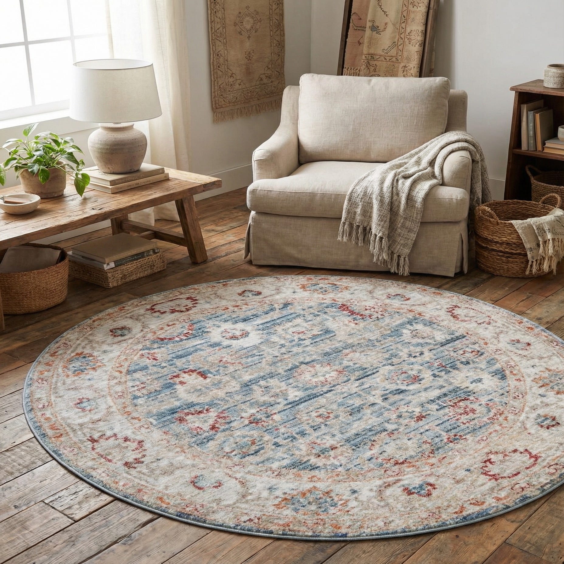 A round blue, beige, and red traditional rug with a distressed floral pattern and ornate border.