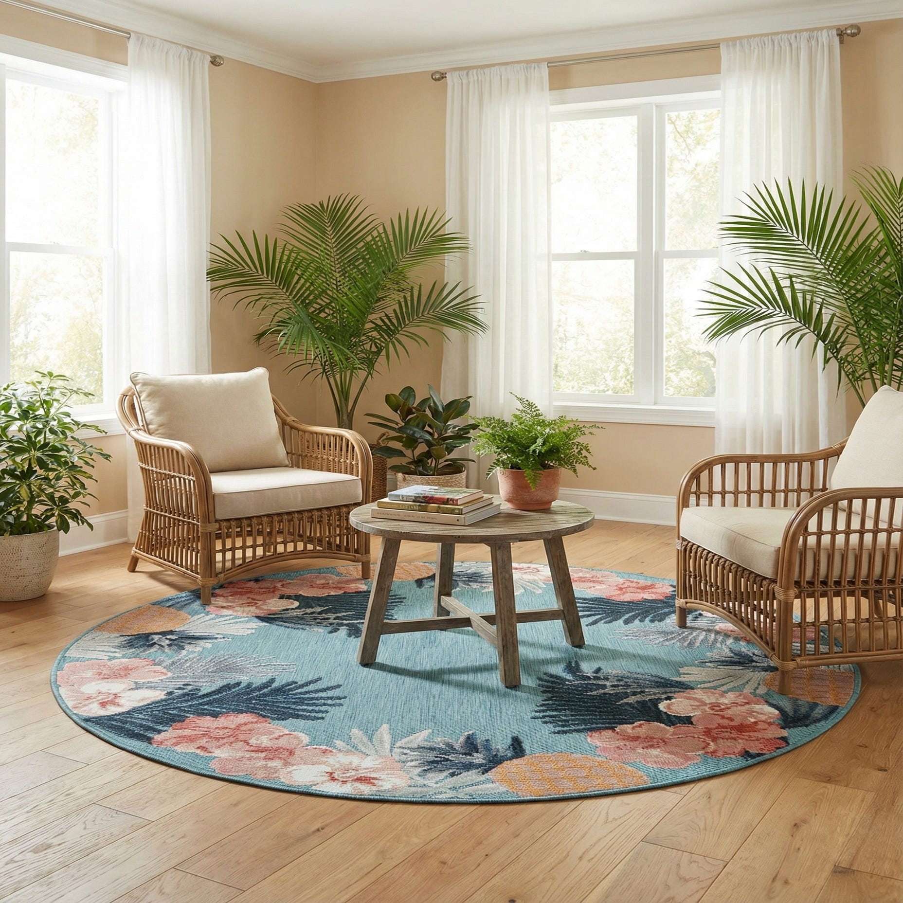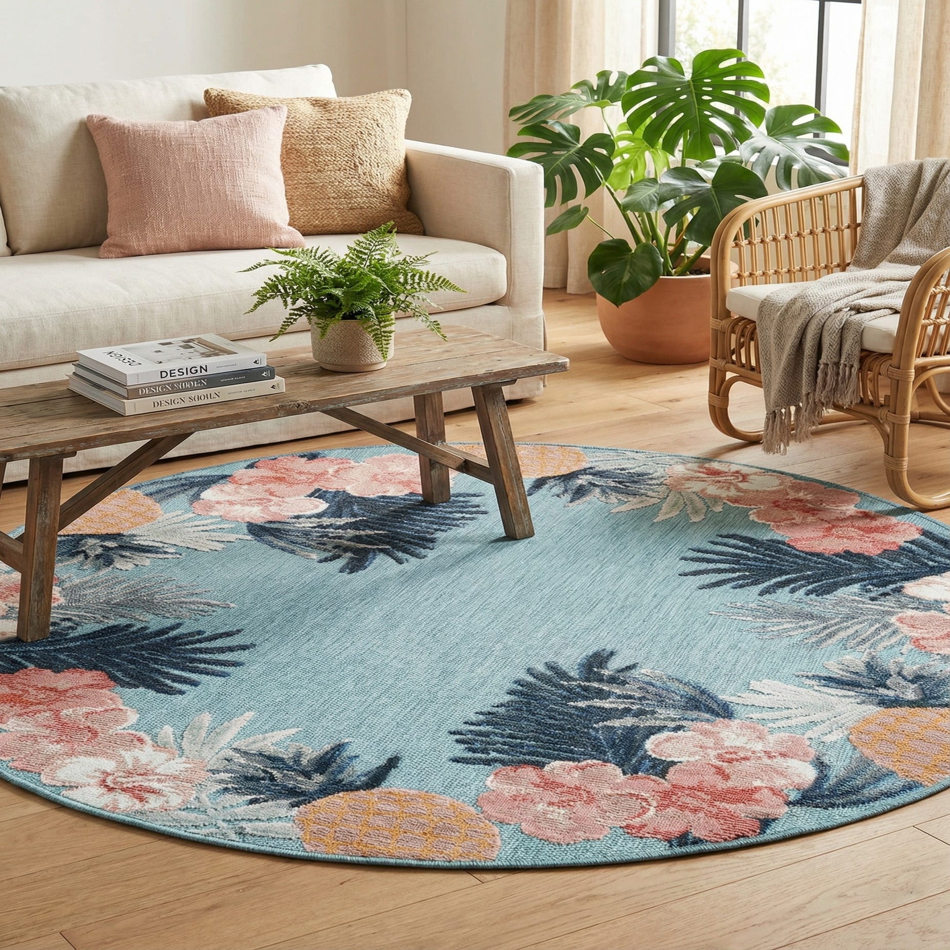 A round blue indoor/outdoor rug with a vibrant border of pink hibiscus, white flowers, blue palm fronds, and orange pineapples.