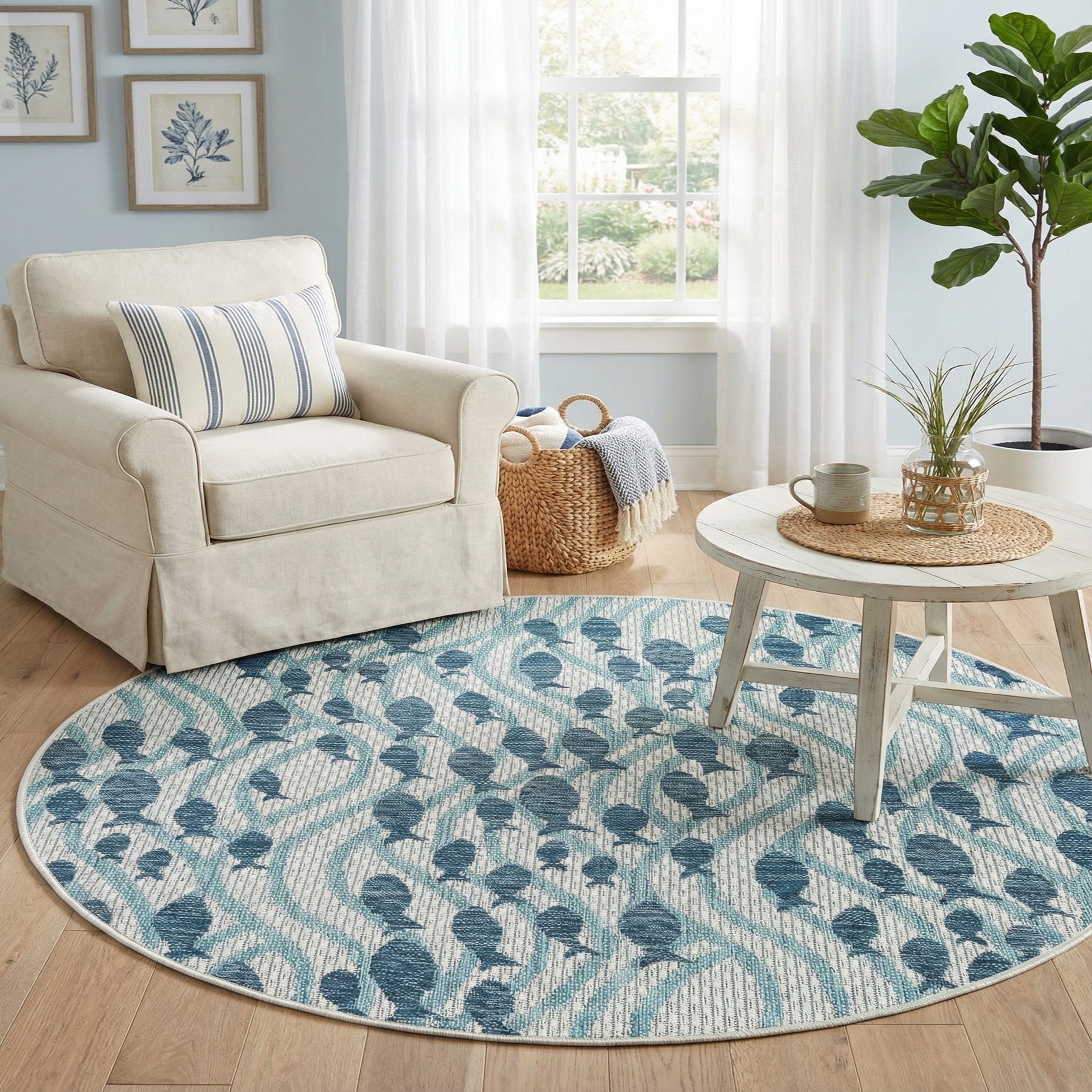 This round design works well on a covered porch or balcony beneath a small bistro set, as an accent in a sunroom, or layered under a round dining table in a casual coastal dining space. Pair it with weathered wood furniture, crisp white slipcovers, navy cushions and natural-fiber accessories to reinforce a relaxed seaside palette, or use it to add a marine-inspired focal point to a lake house entry or screened-in patio.