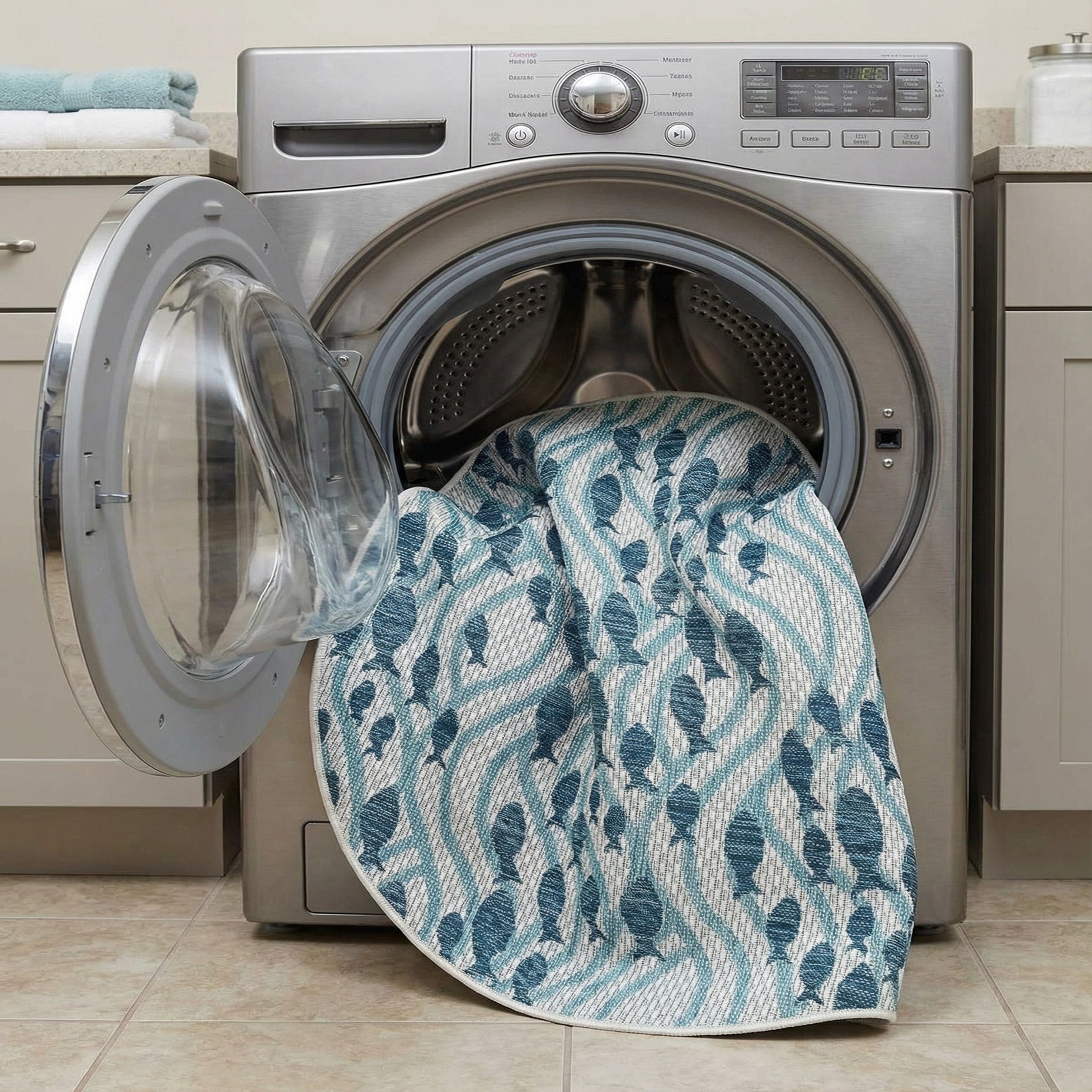 A round blue and white coastal rug featuring a pattern of dark blue fish swimming amidst light blue wavy lines.