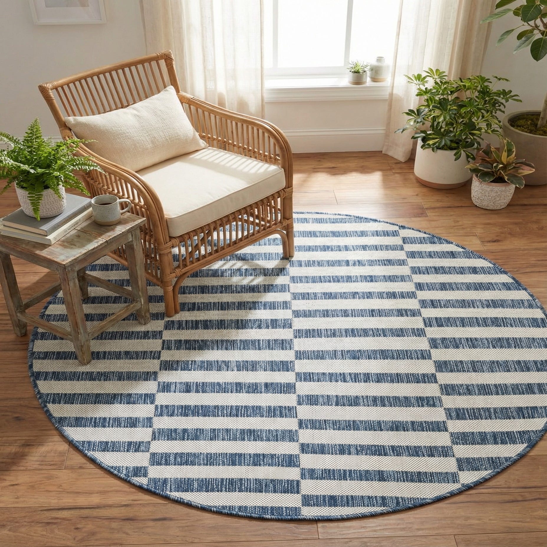 This round style works well on a covered patio, screened porch or sunroom, and can anchor a bistro set or a small seating arrangement. Pair it with teak or white-painted furniture, navy cushions and natural-fiber accents for a coastal or modern casual vibe, or use it to introduce pattern into a minimalist outdoor dining nook or entry area where its graphic lines bring structured interest.