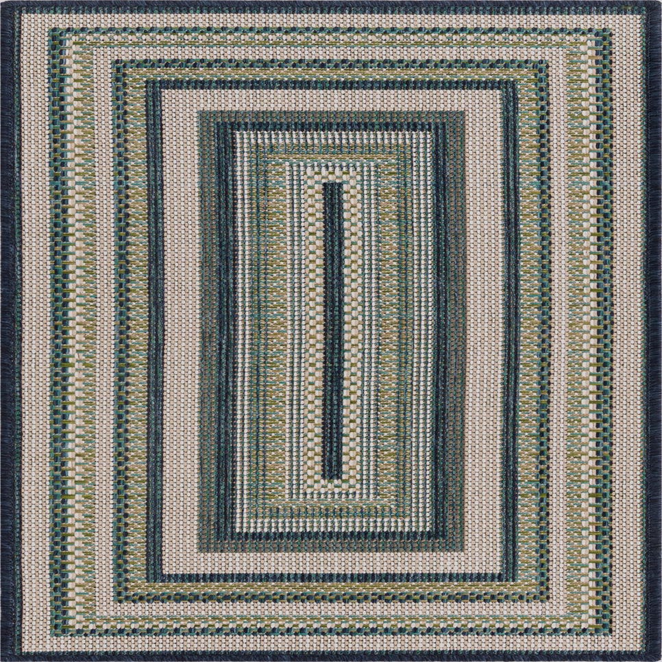A 4 ft runner rug featuring a modern striped pattern in shades of blue, green, and beige, suitable for hallways or patios.
