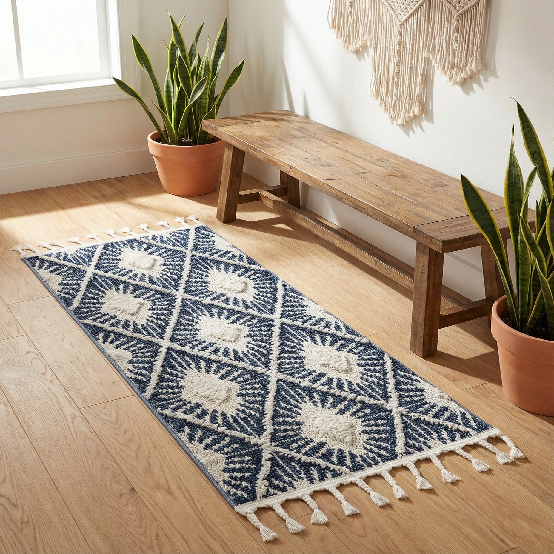 This runner fits well in narrow, transitional spaces—hallways, entryways, or alongside a bed—where its pattern can lead the eye and add warmth without overwhelming. It pairs easily with light- or medium-toned woods, white or washed furniture, and mixed metals for a relaxed, collected look; try it in coastal, cottage, modern farmhouse, or global-inspired interiors. Use it to introduce a bold but measured contrast against pale floors or to anchor a row of seating in a compact living area.