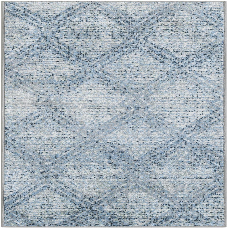 Primary color is Blue. Colors in this rug include: Blue, Gray, Ivory.