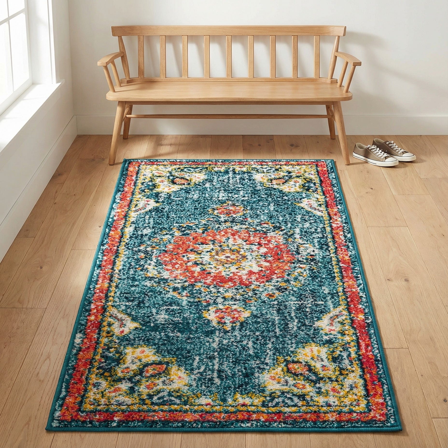 Primary color is Blue. Colors in this rug include: Blue, Gold, Green, Ivory, Navy Blue, Orange, Red, Pink.