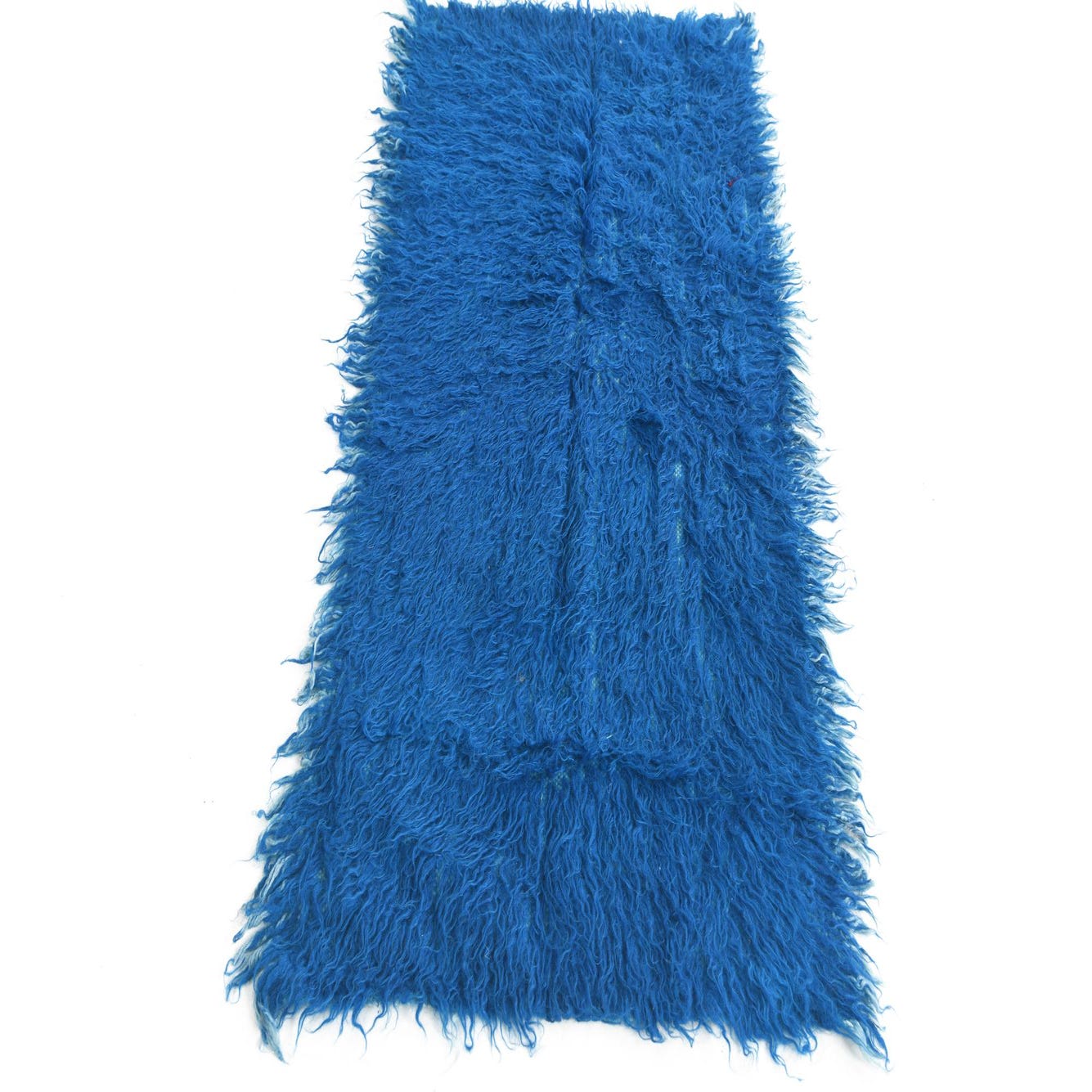 A deep blue hand-knotted runner woven from 100% wool, this piece has a long, shag-style pile that invites touch. The surface reads as a rich, mostly solid blue with natural tonal variation from the individual wool locks and a subtle center seam that runs lengthwise. Edges finish into soft, irregular fringe and the dense, lofted pile creates a tactile, sculpted texture that catches light and movement.