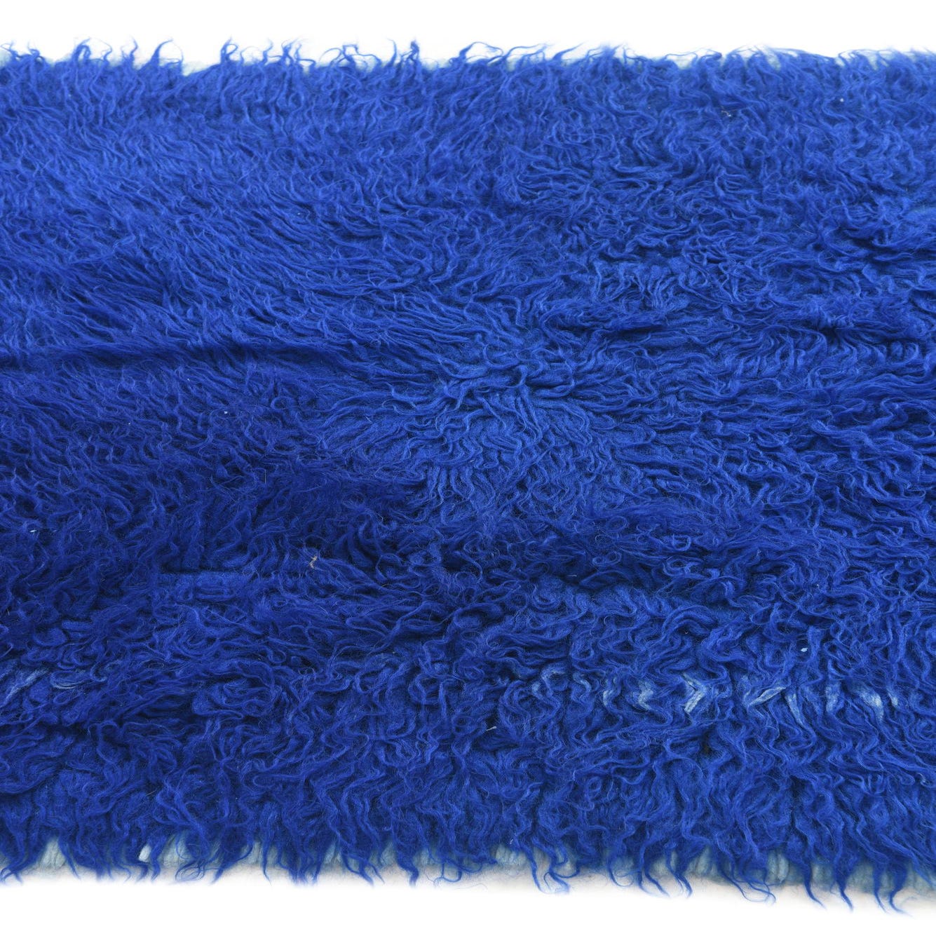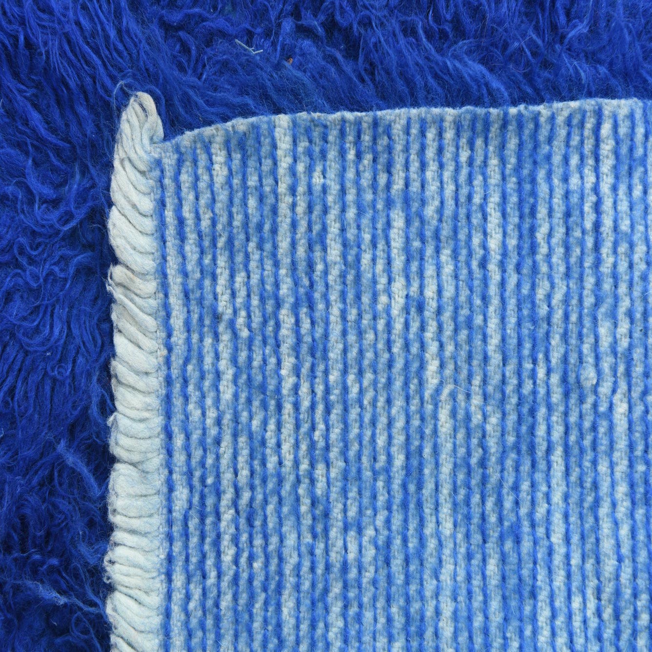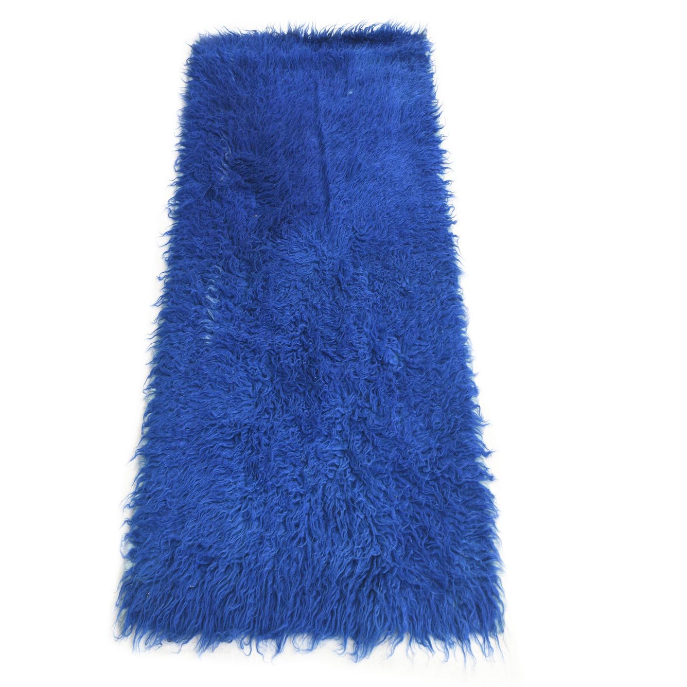 A deep blue, long-pile runner with a single, solid field and natural variation in the wool pile. The hand-knotted construction produces a shaggy surface of curly, lofty fibers that feel plush and springy to the touch, with slight shifts in texture where the pile catches the light. The edges follow the organic flow of the pile, giving the piece a relaxed, tactile silhouette rather than a rigid border.