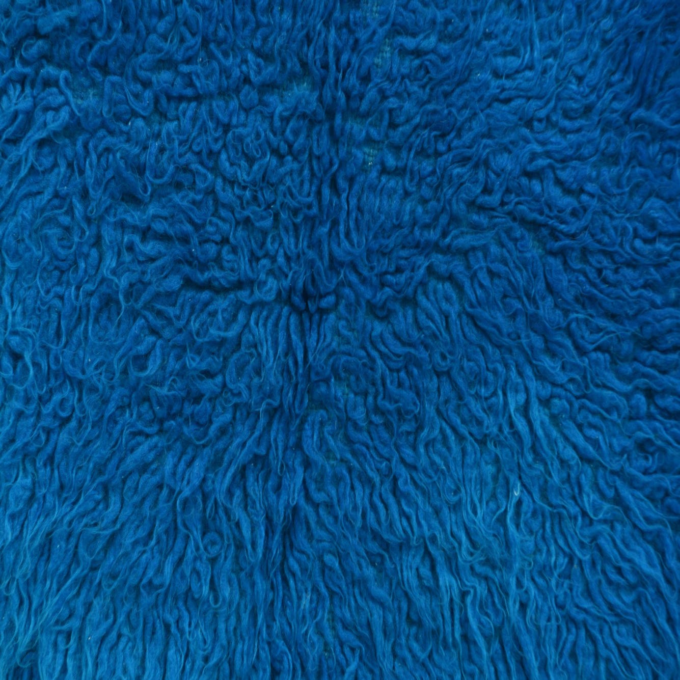 A vibrant blue 4 ft runner rug with a thick, shaggy pile, handmade from wool, perfect for a hallway.
