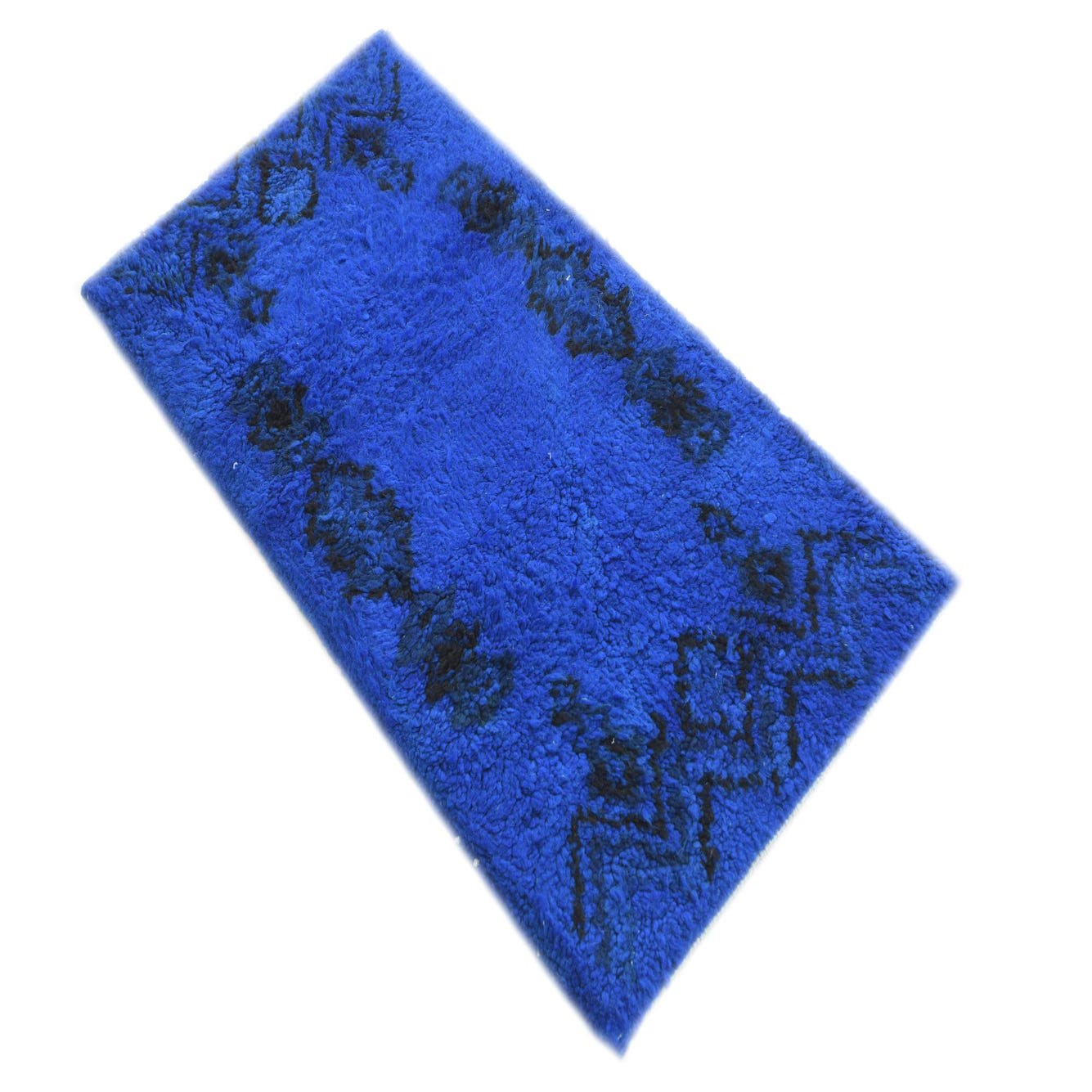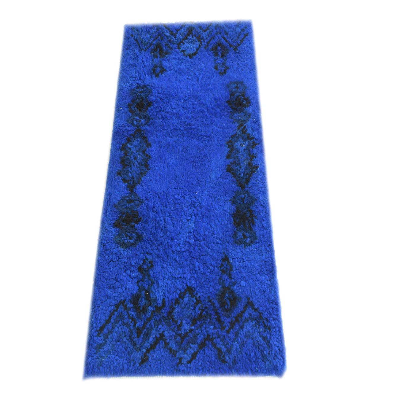 A vibrant blue 4 ft runner rug with a plush shag pile, featuring abstract black tribal patterns along its borders.