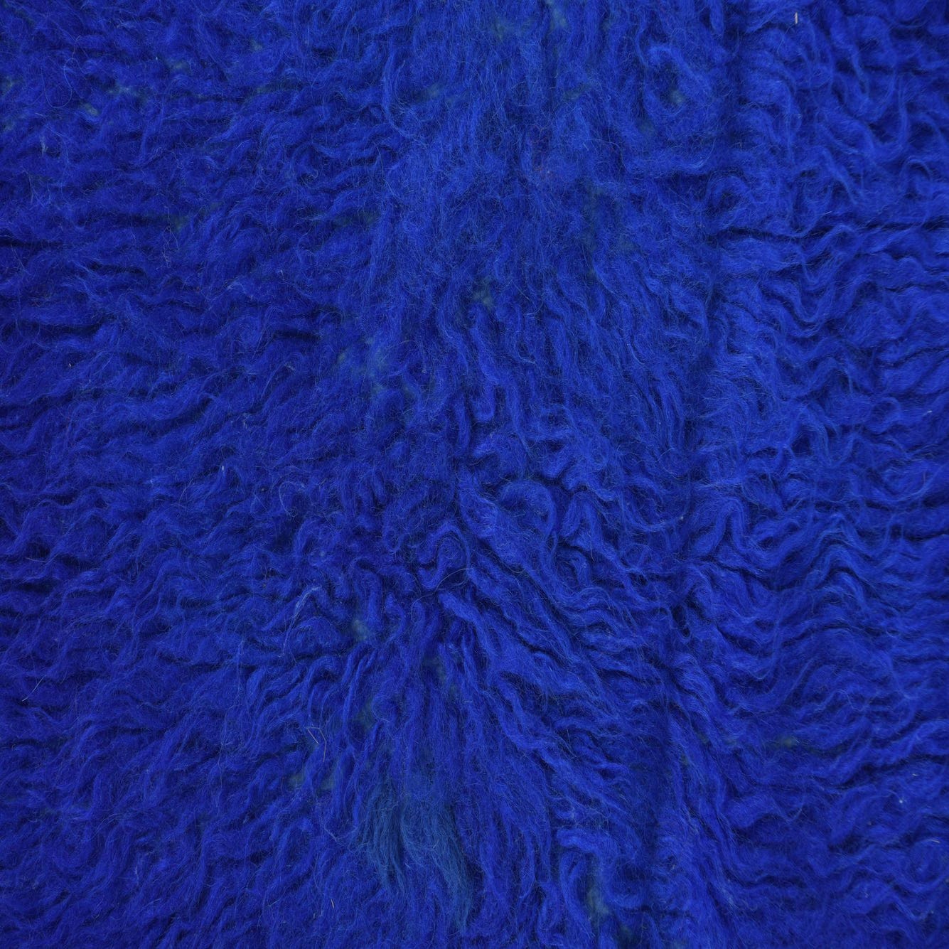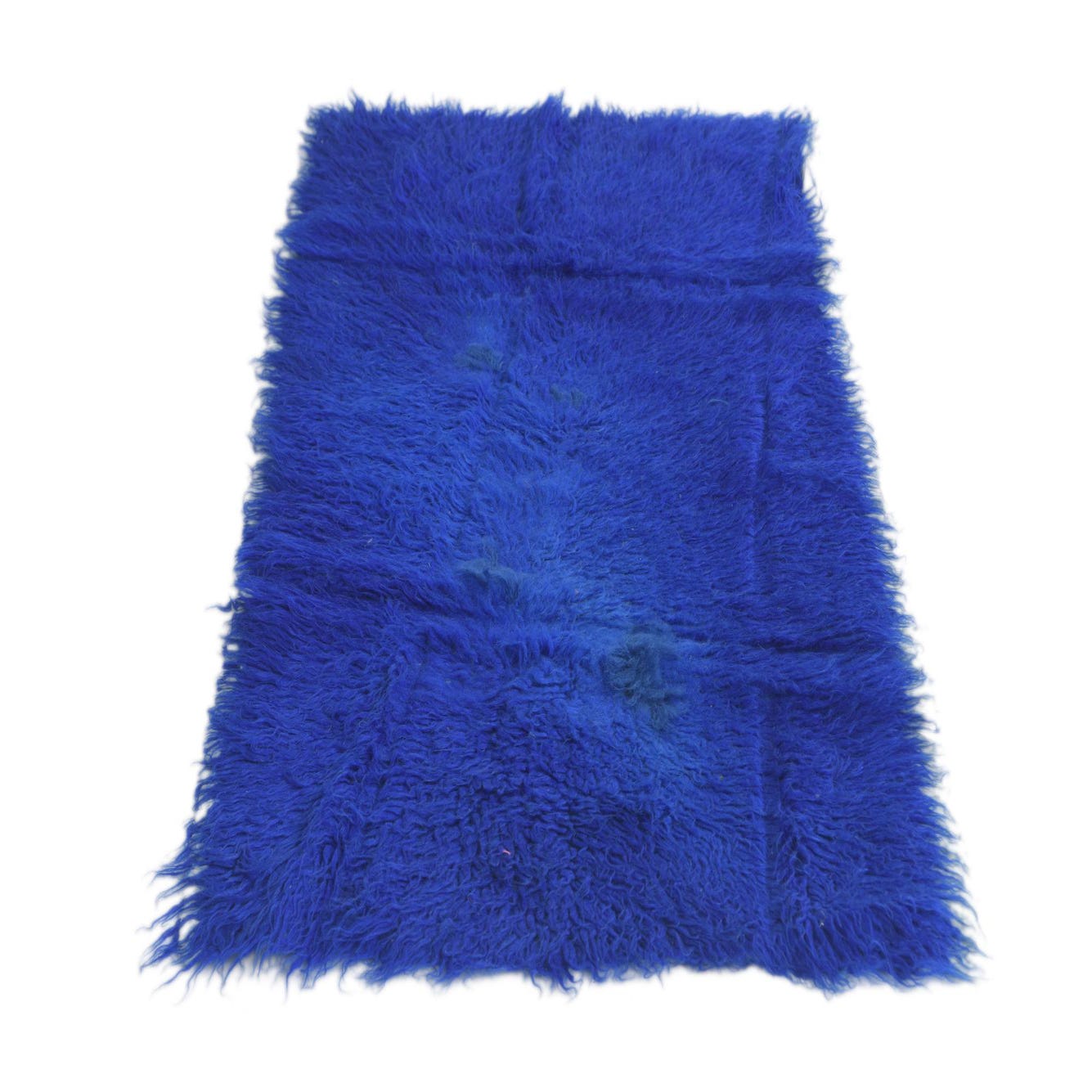 A vibrant blue 4 ft runner rug with a plush shag pile, handmade from wool, perfect for a hallway.