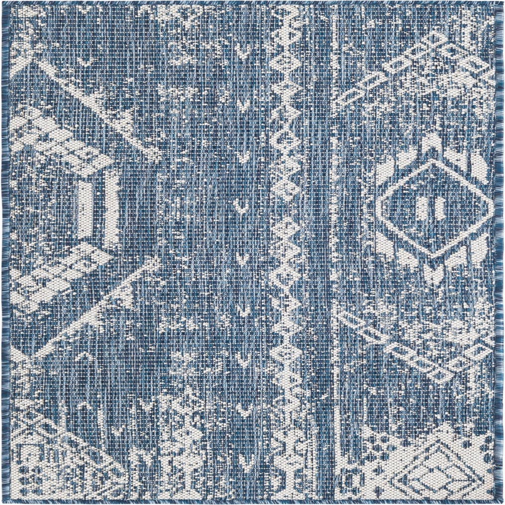 A 4 ft runner rug in blues with a modern geometric pattern and textured flatweave, suitable for indoor/outdoor use.