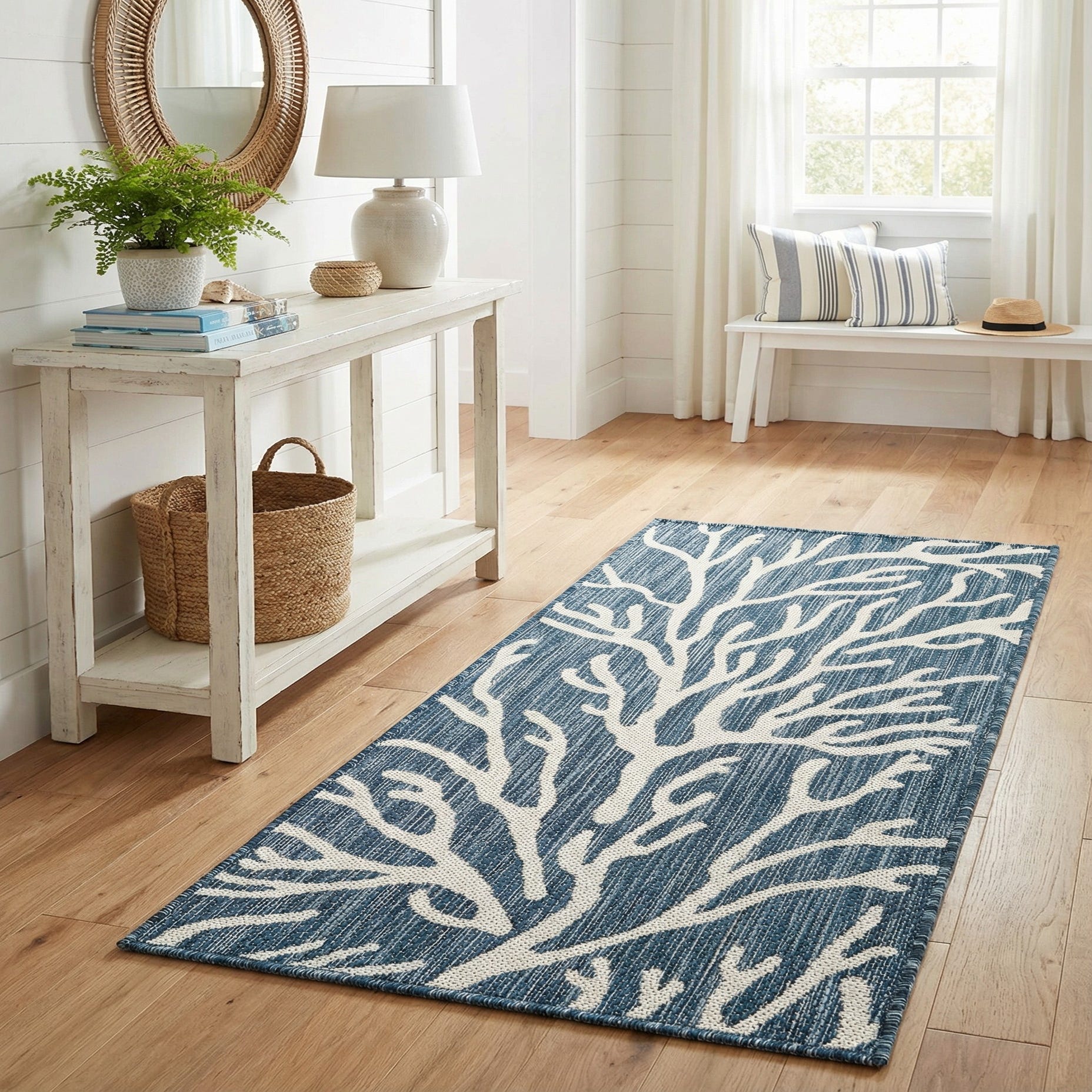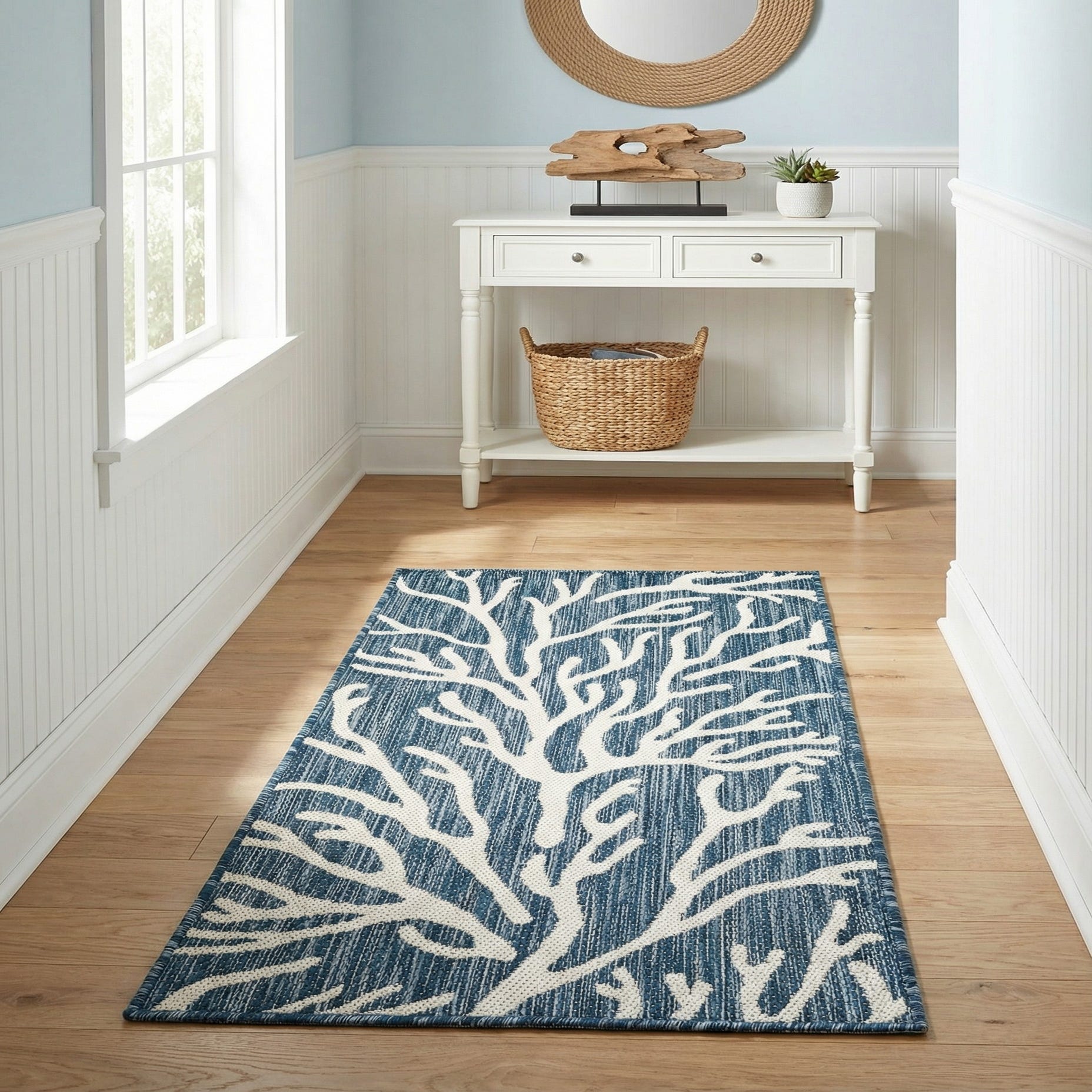 A 4 ft runner rug featuring a white coral pattern against a textured blue background, perfect for a coastal hallway or patio.