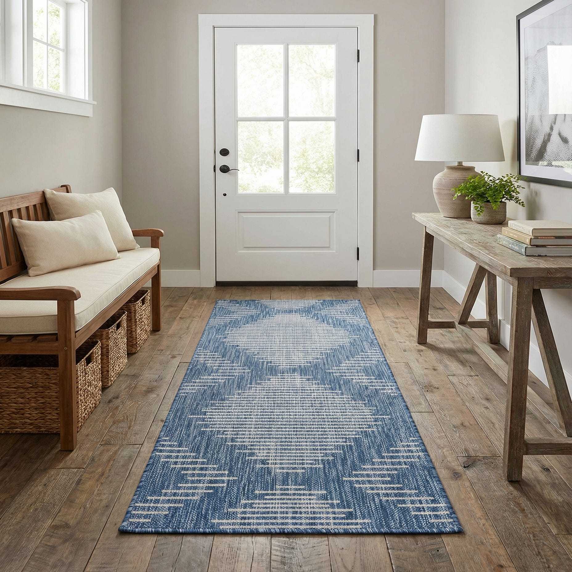 A 4 ft runner rug in shades of blue with a white Southwestern-inspired geometric pattern, suitable for indoor or outdoor use.