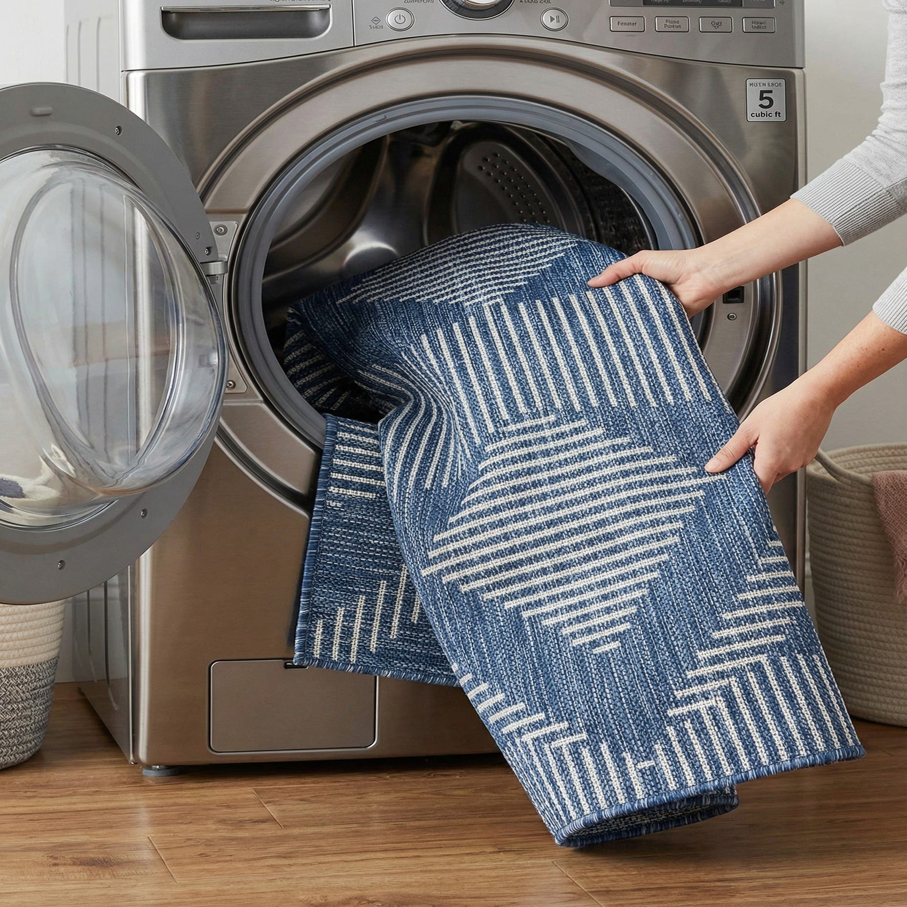 The rug's pet-friendly design ensures durability and ease of maintenance, which is particularly beneficial for homes with furry family members. Given its modern design and resilient material, this runner is well-suited for outdoor settings such as patios and decks, as well as indoor spaces like entryways and hallways where a touch of sophistication is desired. Its clean lines and crisp colors complement minimalist, Scandinavian, or coastal interior themes, lending a fresh look to the chosen environment.