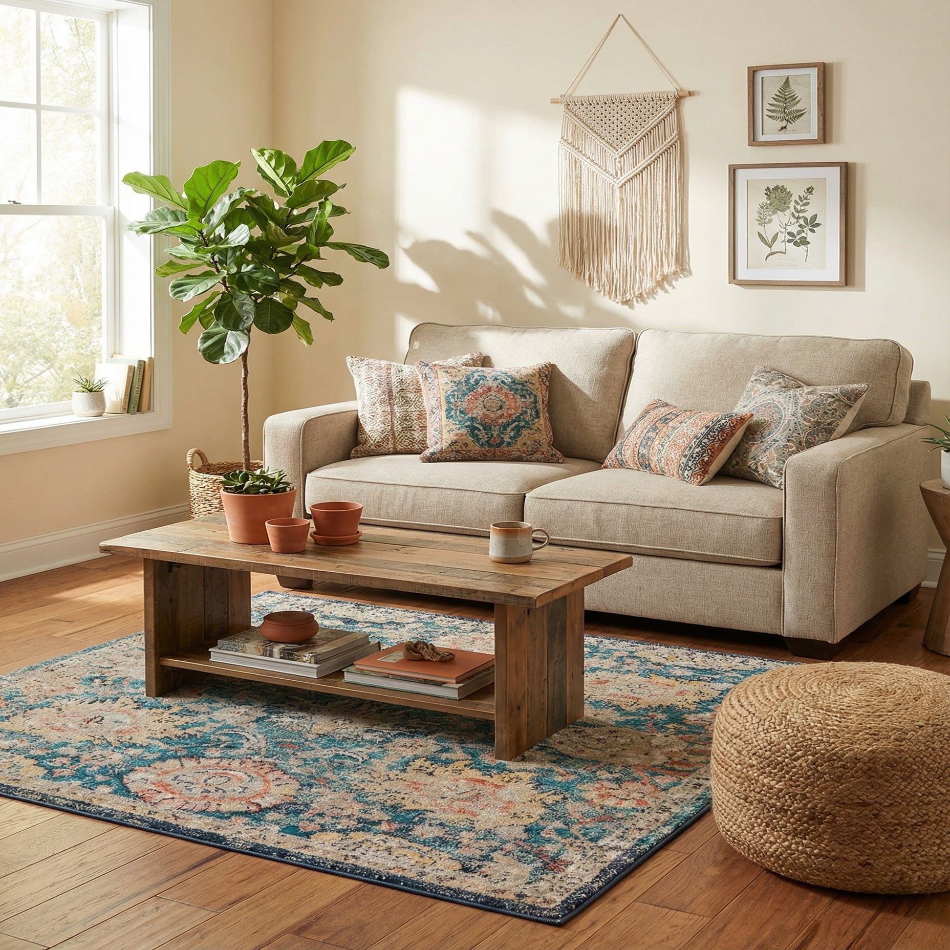 Machine-made polypropylene construction delivers a low-profile, soft-to-the-touch pile with subtle cut-pile definition that highlights the color variations and pattern detail. This rug works well anchored under a coffee table in a living room, layered in a bedroom seating area, or placed in an entry or home office to introduce color and pattern without overwhelming the space. Pair it with warm wood furniture, cream or navy upholstery, and mixed-metal accents for a balanced, comfortable look.