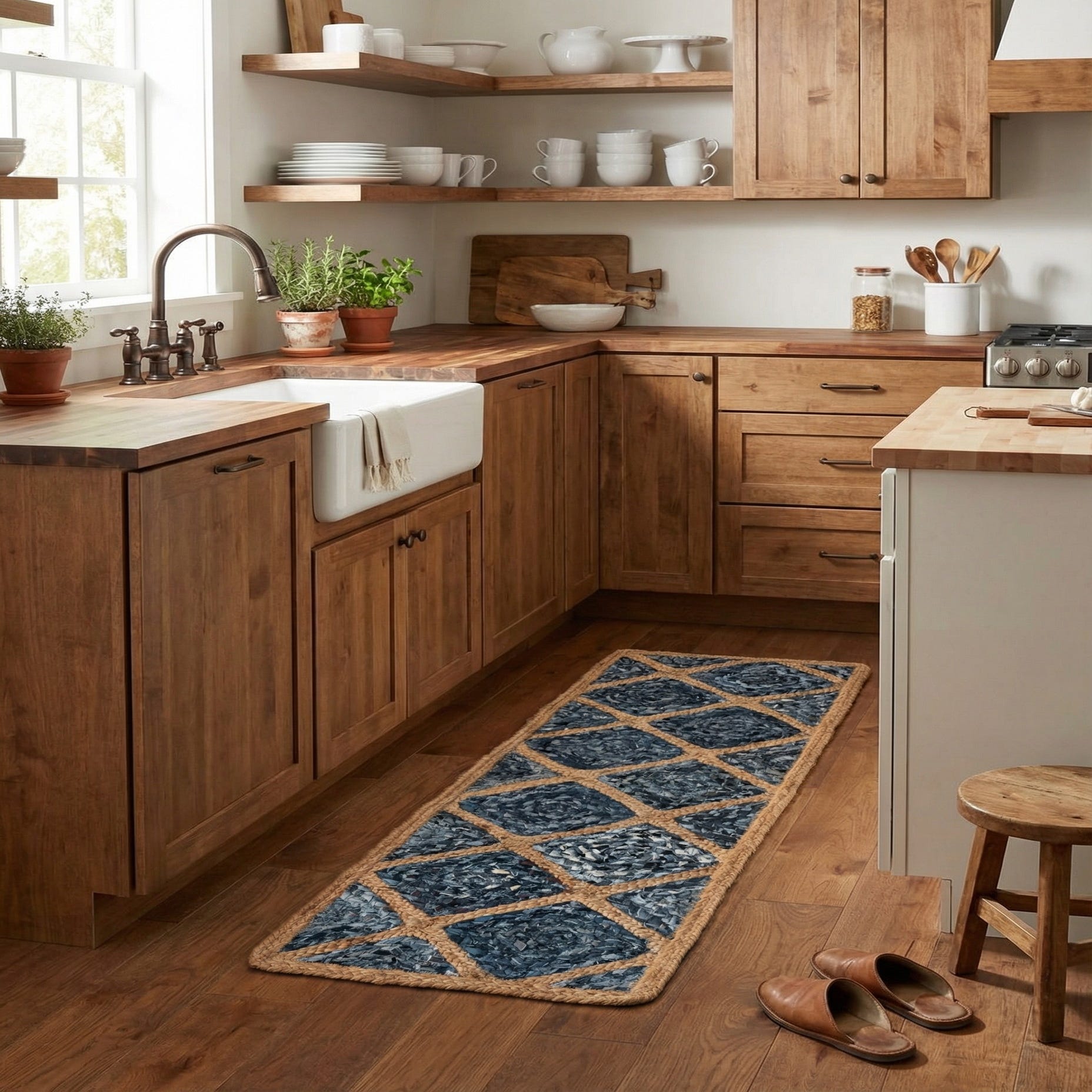 This runner works well in relaxed, coastal or farmhouse settings, where the navy and natural tones complement weathered woods and whitewashed finishes. It also pairs nicely with modern casual dining — use it down the center of a dining table with neutral linens and simple tableware — or place it on a console or kitchen island to add texture and color. The mix of natural fiber and blue tones fits bohemian, cottage, and transitional interiors that favor layered, tactile accents.