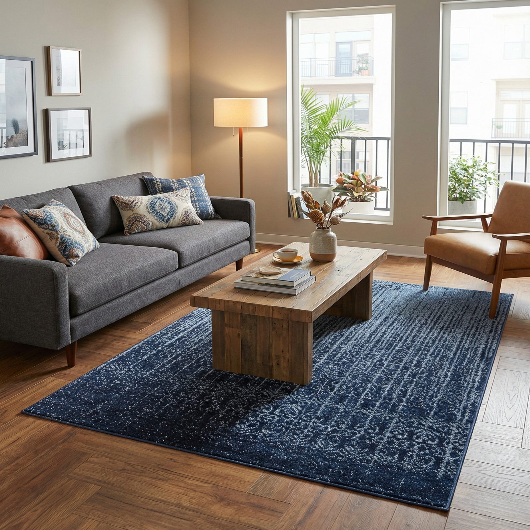 The background of the rug is a rich blue, overlaid with a navy accent to create a multi-dimensional look that can anchor a room. Its machine-woven construction ensures a tight and durable weave that is stain-resistant and shed-free, making it a practical choice for busy areas.