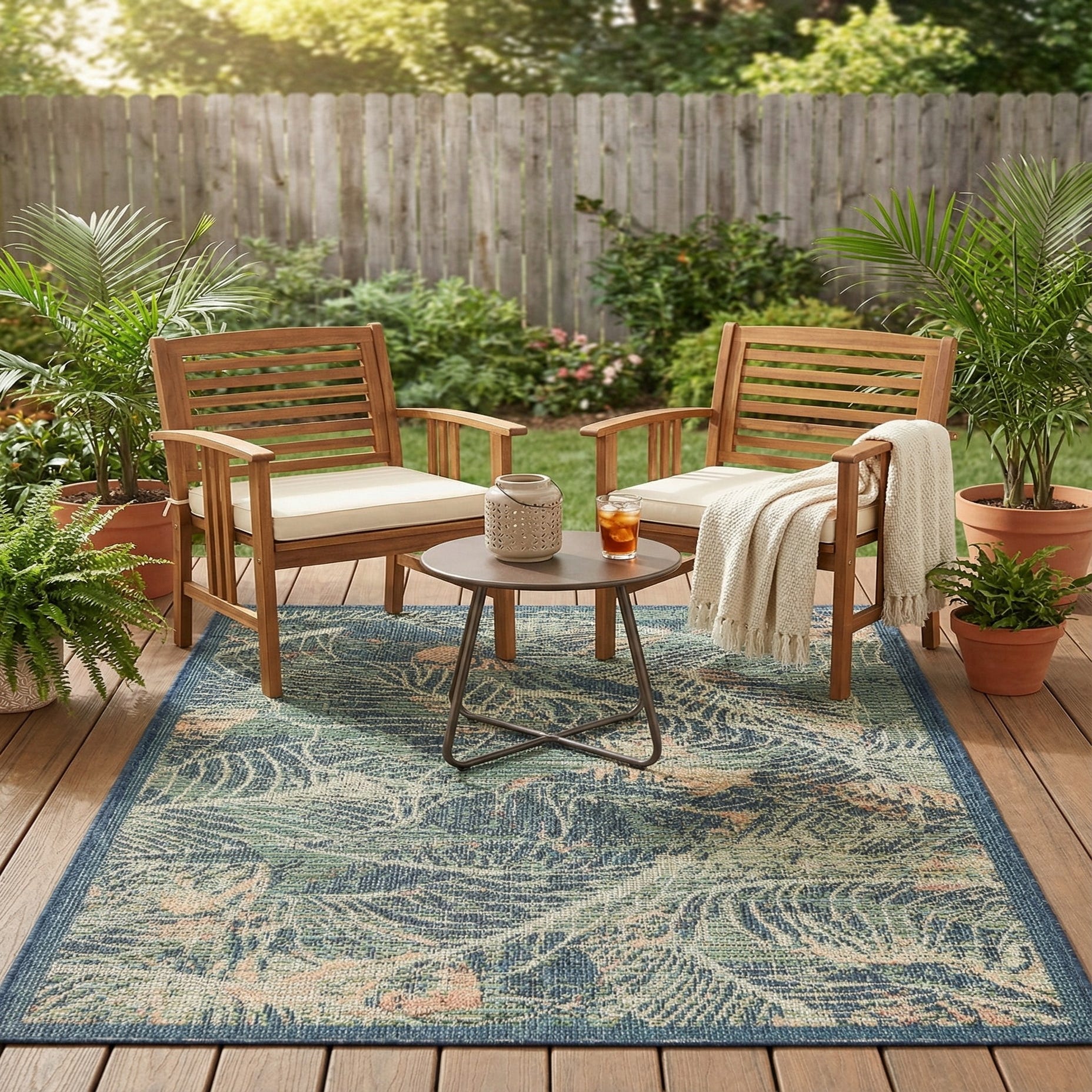 A rectangular 4x6 Baja Outdoor rug featuring a blue, green, and beige botanical pattern with a thin pile.