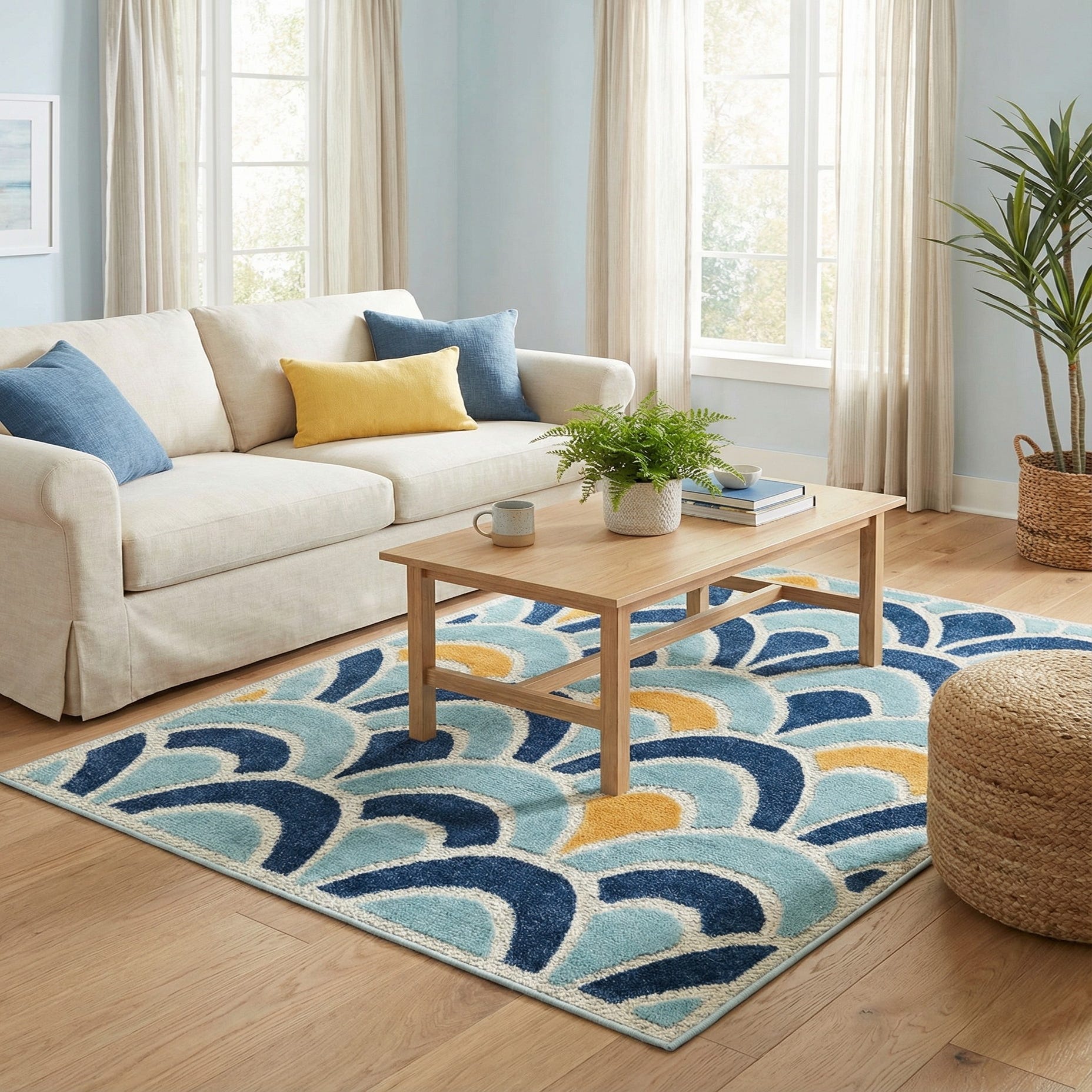 A 4x6 rectangular indoor/outdoor rug with a modern trellis pattern in shades of blue, light blue, and orange on a cream background.