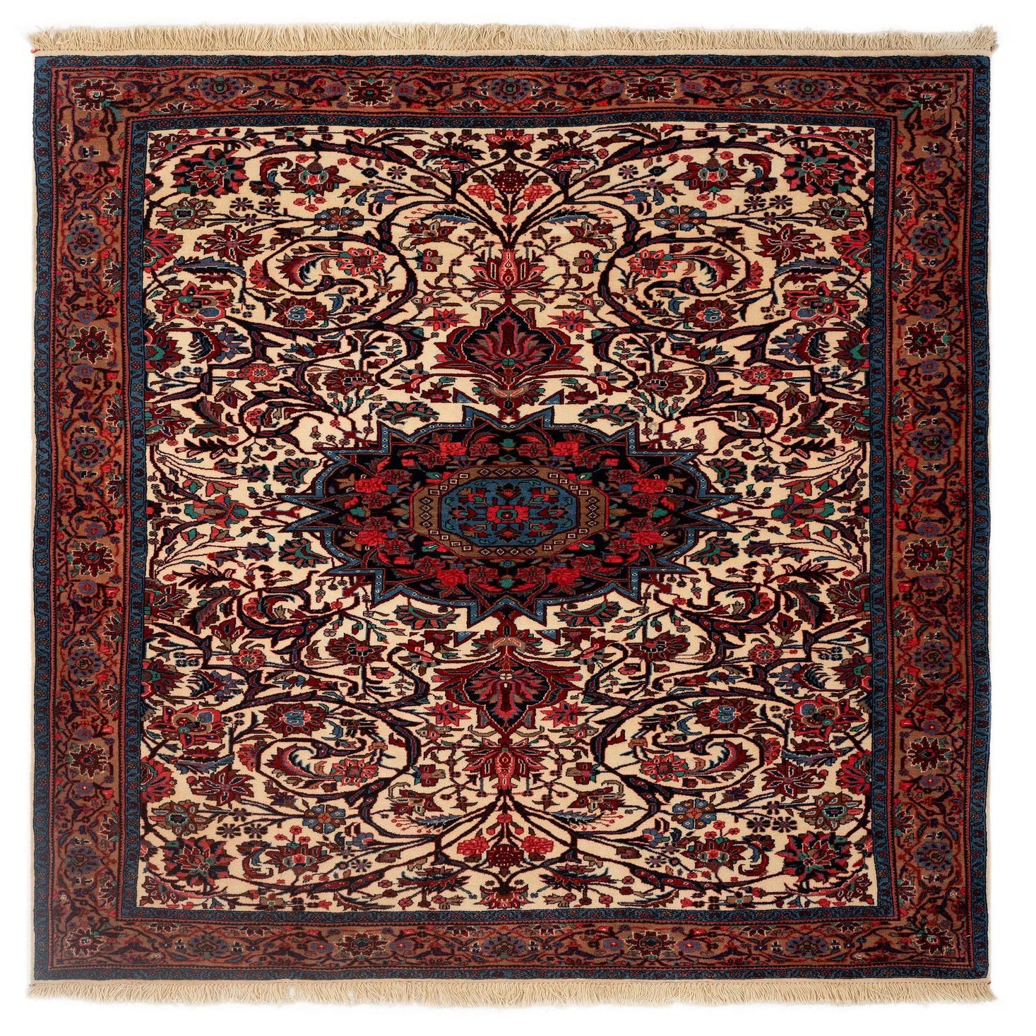 A 4x6 rectangular Bidjar Persian rug with a cream background, intricate blue and red floral patterns, and a central medallion.