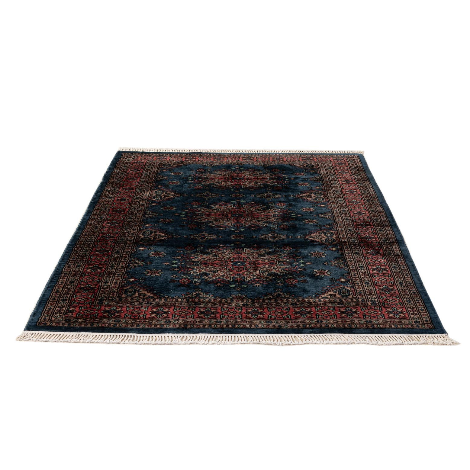 A 4x6 rectangular Bokhara wool rug in deep blue with traditional tribal patterns in red, beige, and black, featuring white fringe.