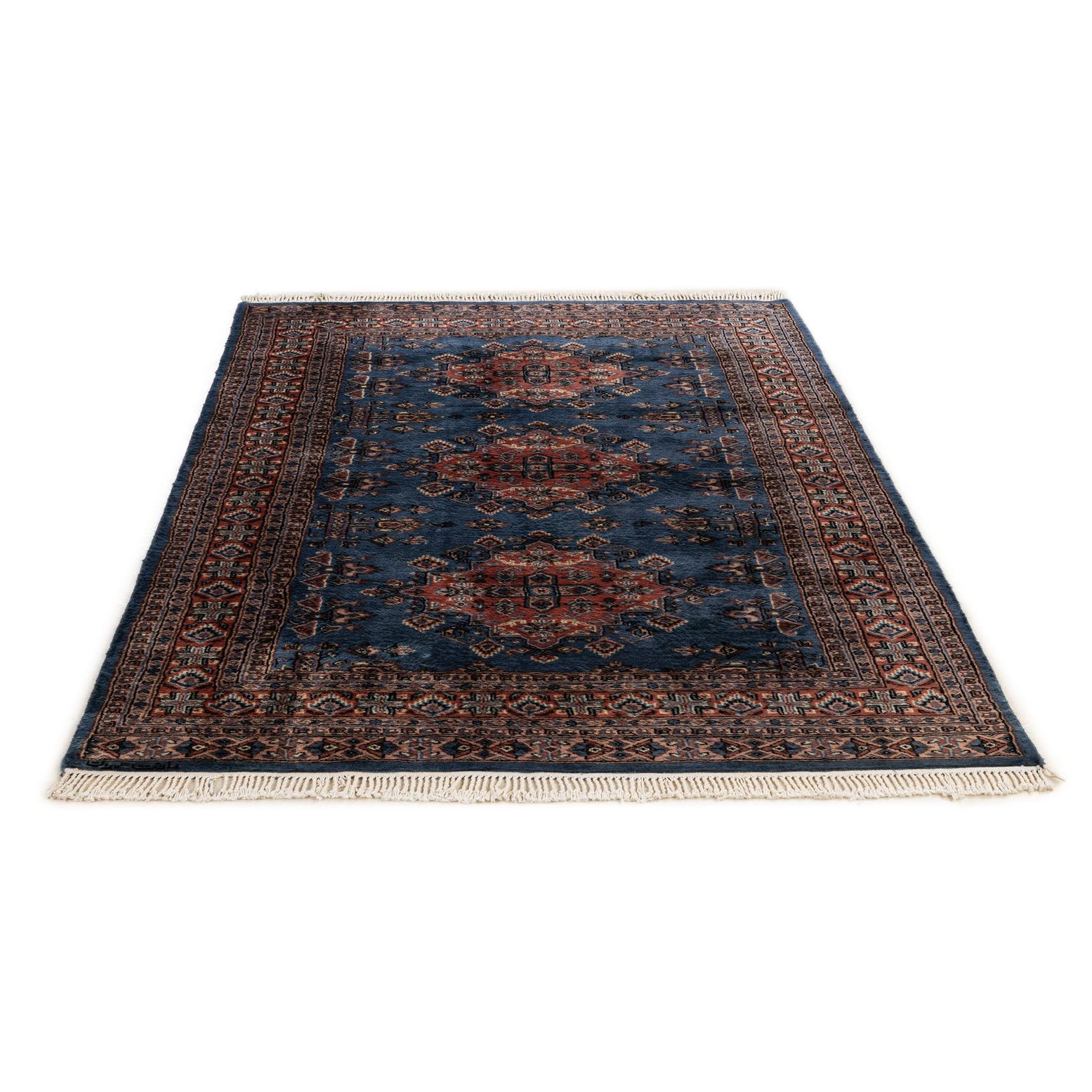 A 4x6 rectangular Bokhara rug featuring a deep blue field with intricate tribal and traditional patterns in shades of rust, cream, and black, framed by a detailed border.