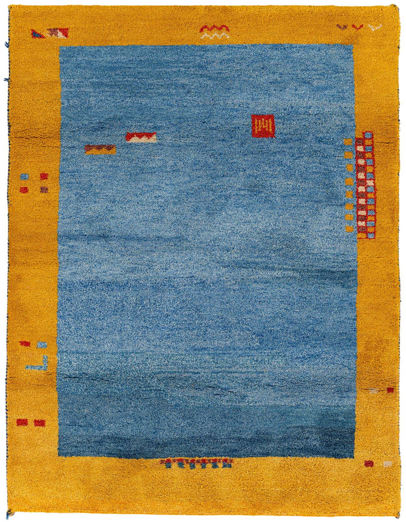 Primary color is Blue. Colors in this rug include: Blue, Yellow, Red, Ivory.