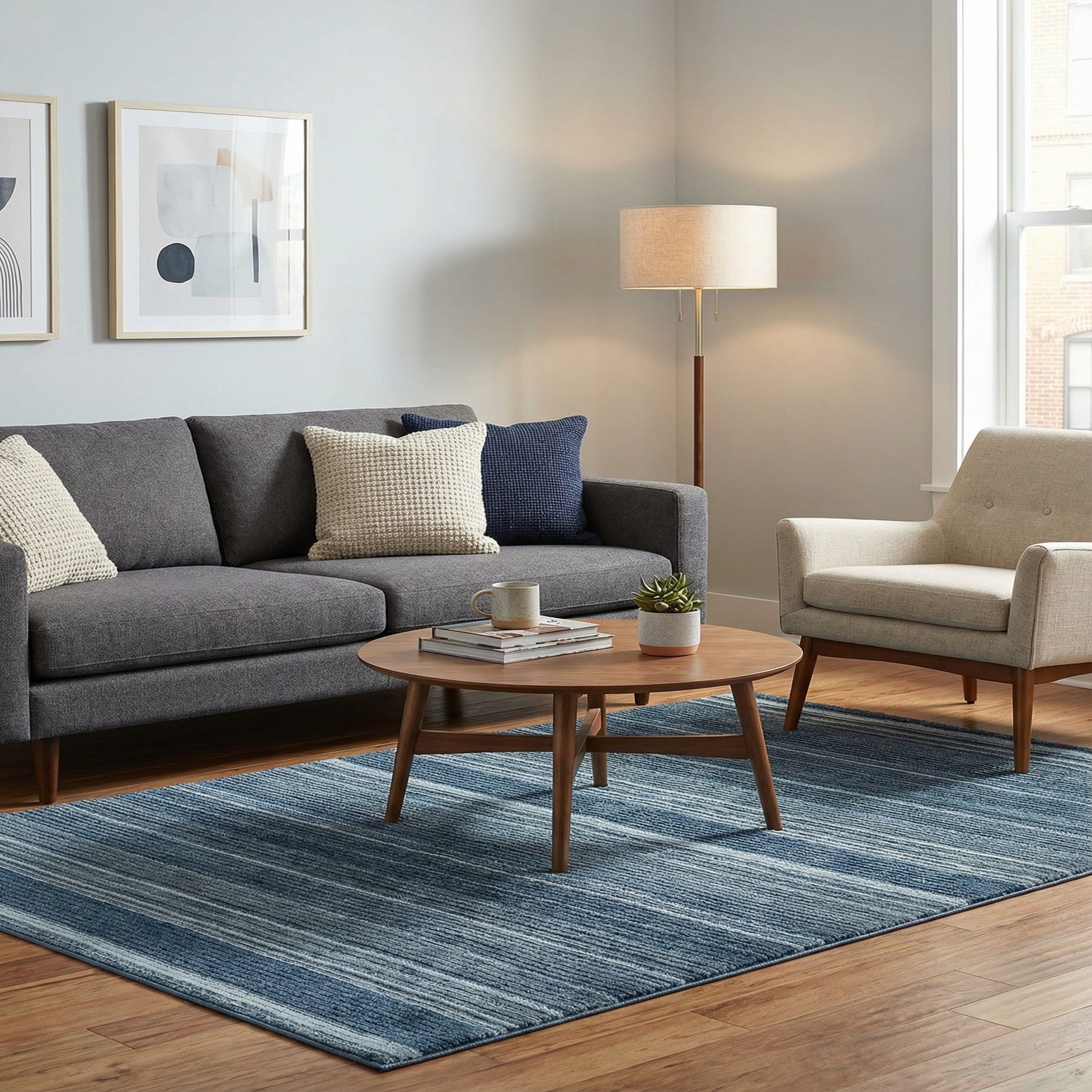 This rug fits a range of interior styles from modern and coastal to transitional. It pairs well with light-wood or bleached finishes, gray or navy upholstery, and brushed-metal accents for a layered, collected look. Place it in an entryway, in front of a sofa to anchor a small seating area, or beside a bed to add a cool, grounding layer that ties together blue and gray color schemes.