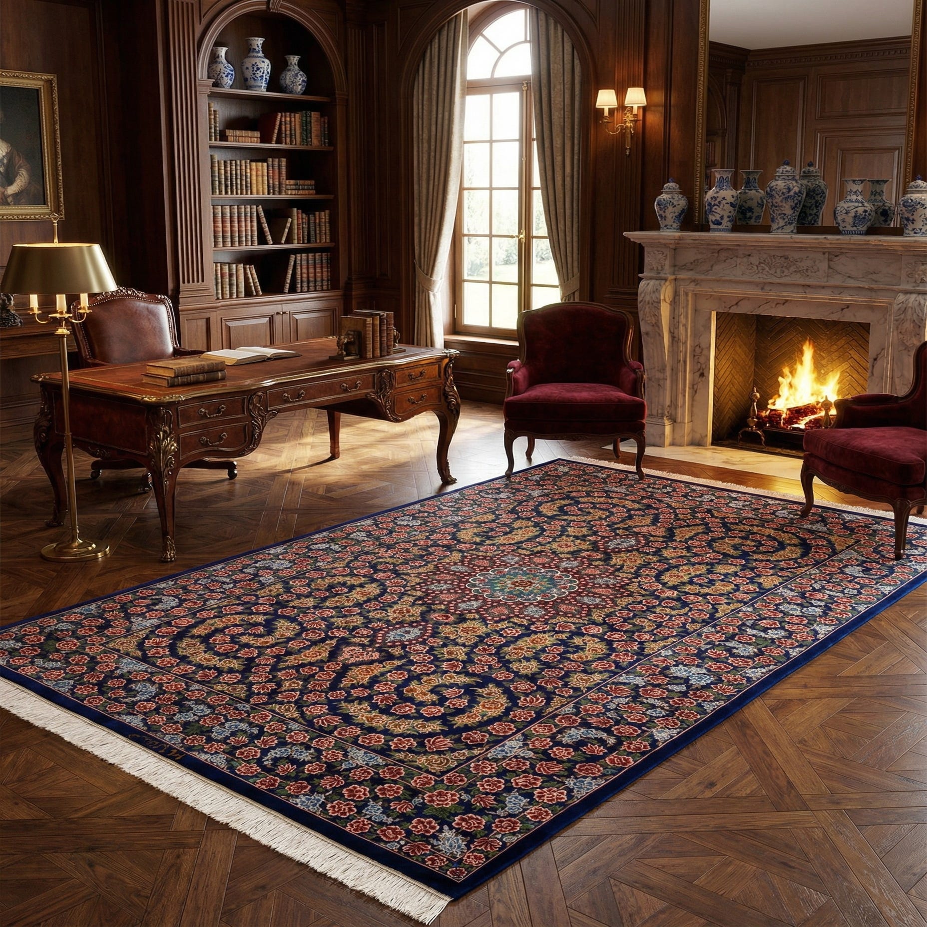 This rug would be a splendid addition to spaces that embrace classic decor, yet it remains versatile enough to complement a more modern aesthetic seeking a touch of time-honored elegance. Ideal settings include formal living rooms, studies, or bedrooms where its rich colors and detailed pattern can serve as a focal point. Moreover, it could provide a striking contrast in a minimalist environment, adding depth and warmth to the space.