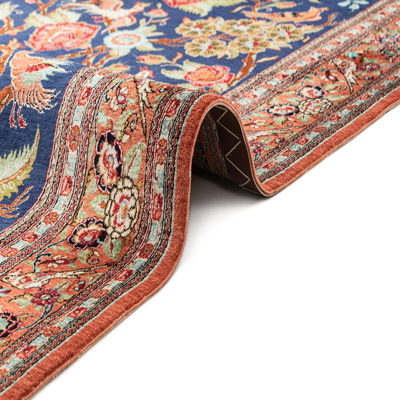 A 4x6 rectangular Ghom Silk rug with a deep blue field featuring a tree-of-life design with red flowers and birds, bordered by intricate coral and blue patterns.
