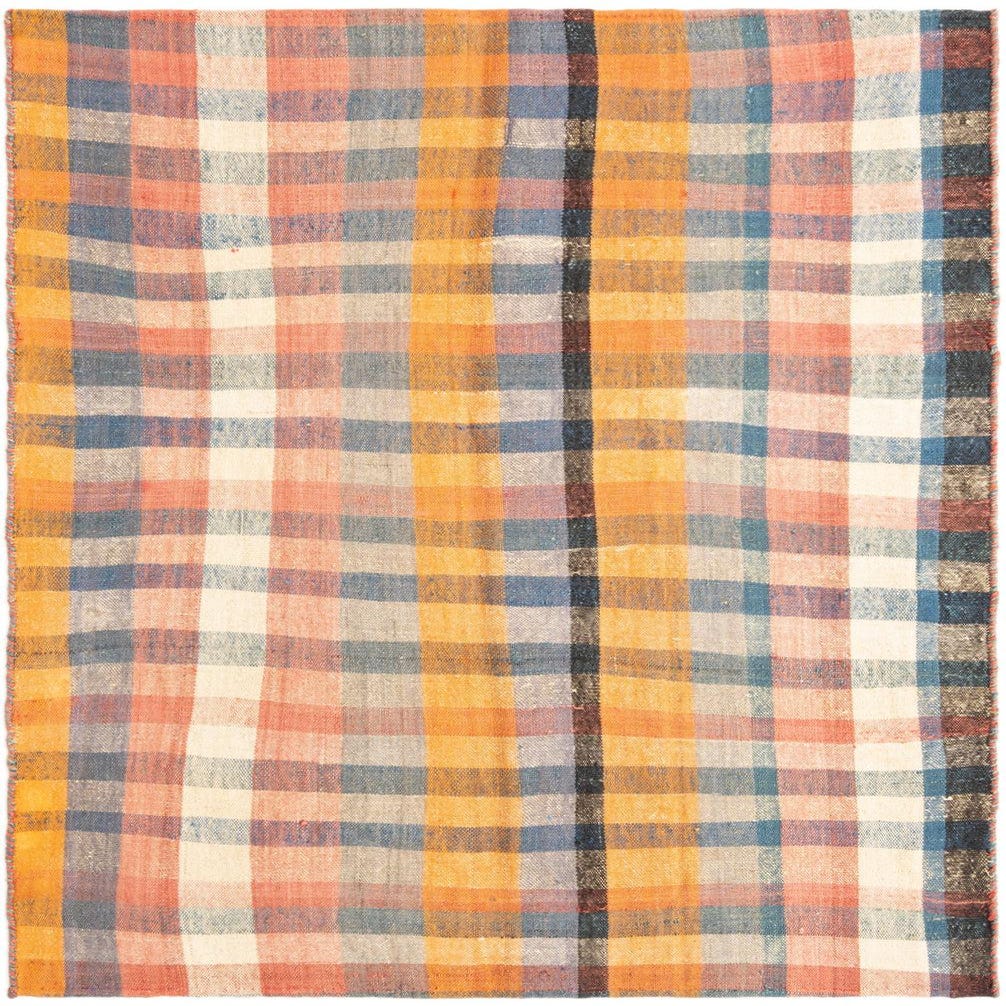 A 4x6 rectangular Jajim rug with a colorful plaid pattern in shades of blue, orange, red, and cream.