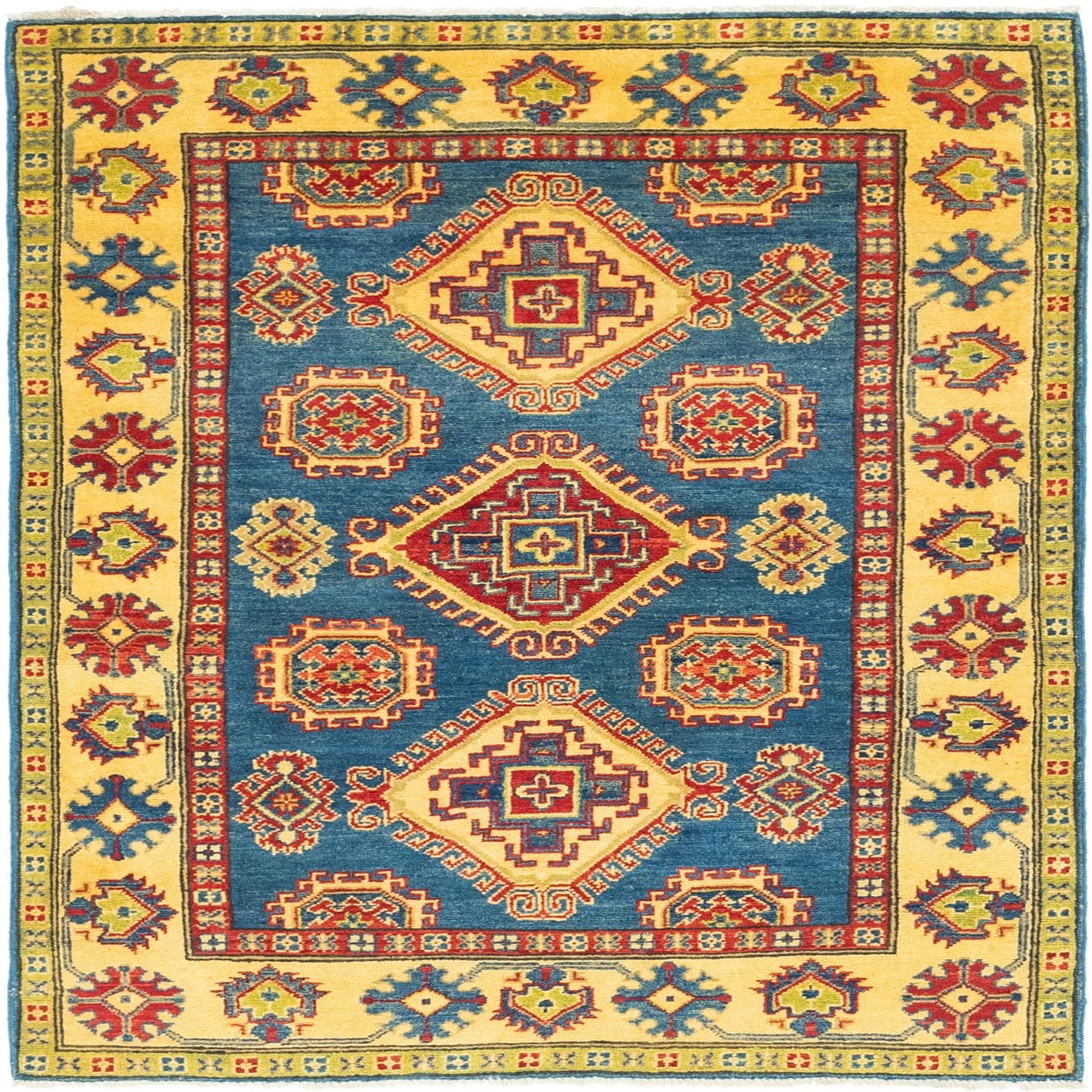 A 4x6 rectangular blue and yellow Kazak rug with traditional tribal medallion patterns, perfect for a living room.