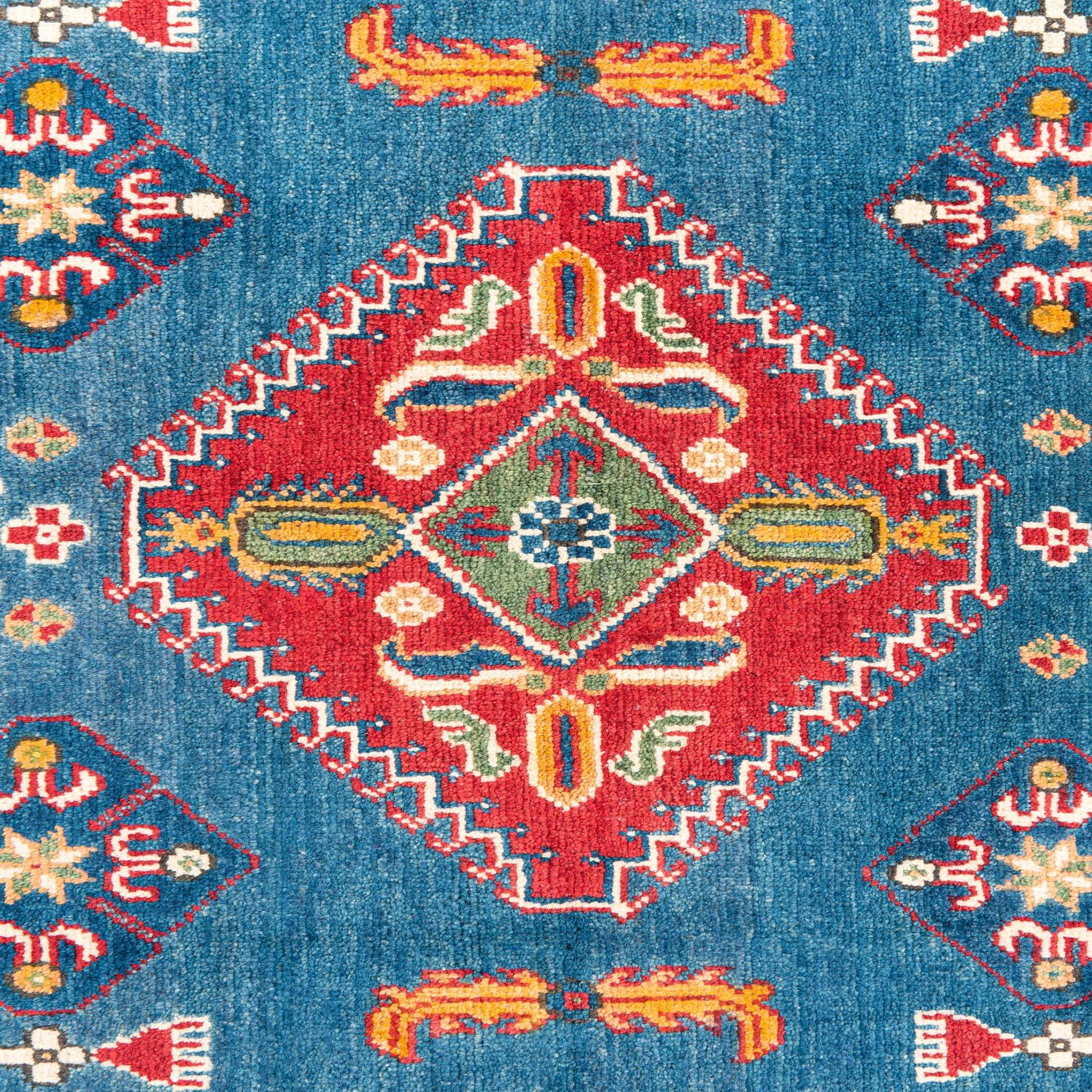 A 4x6 rectangular blue Kazak rug with traditional Southwestern and Oriental medallion patterns in red, cream, and green.