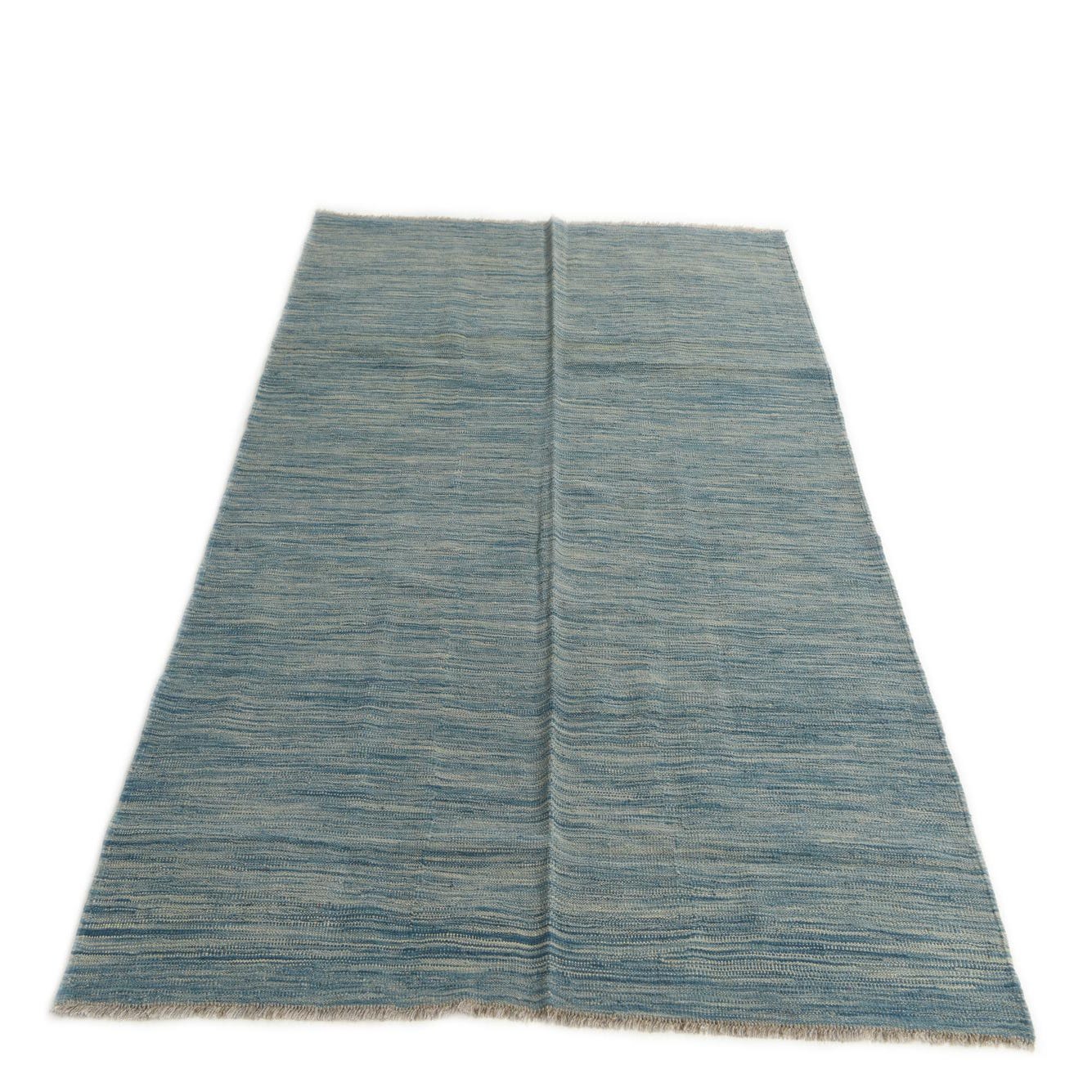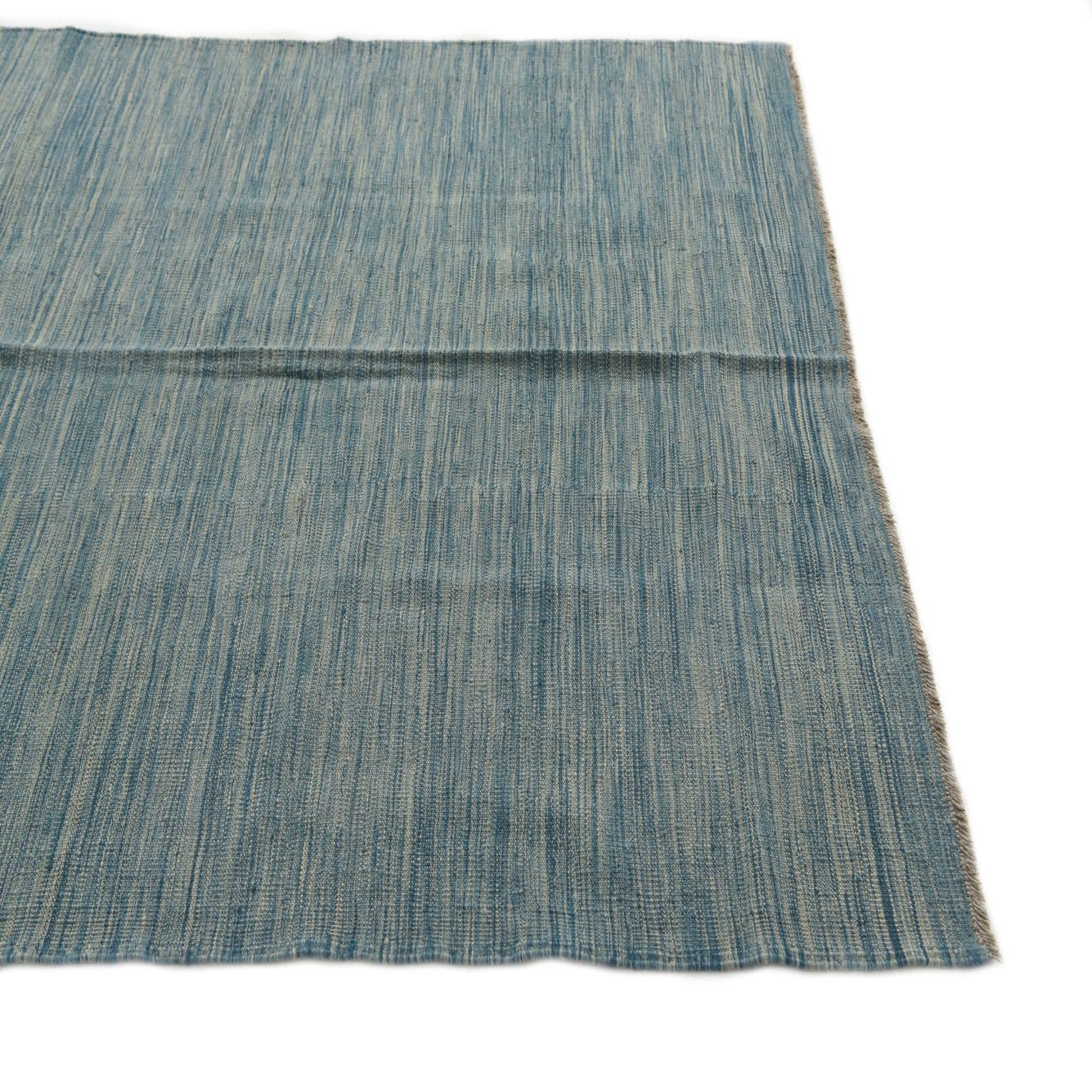 A 4x6 rectangular Kilim Modern rug from Rugs.com, featuring an abstract tribal pattern in varying shades of blue, with a flatweave texture.