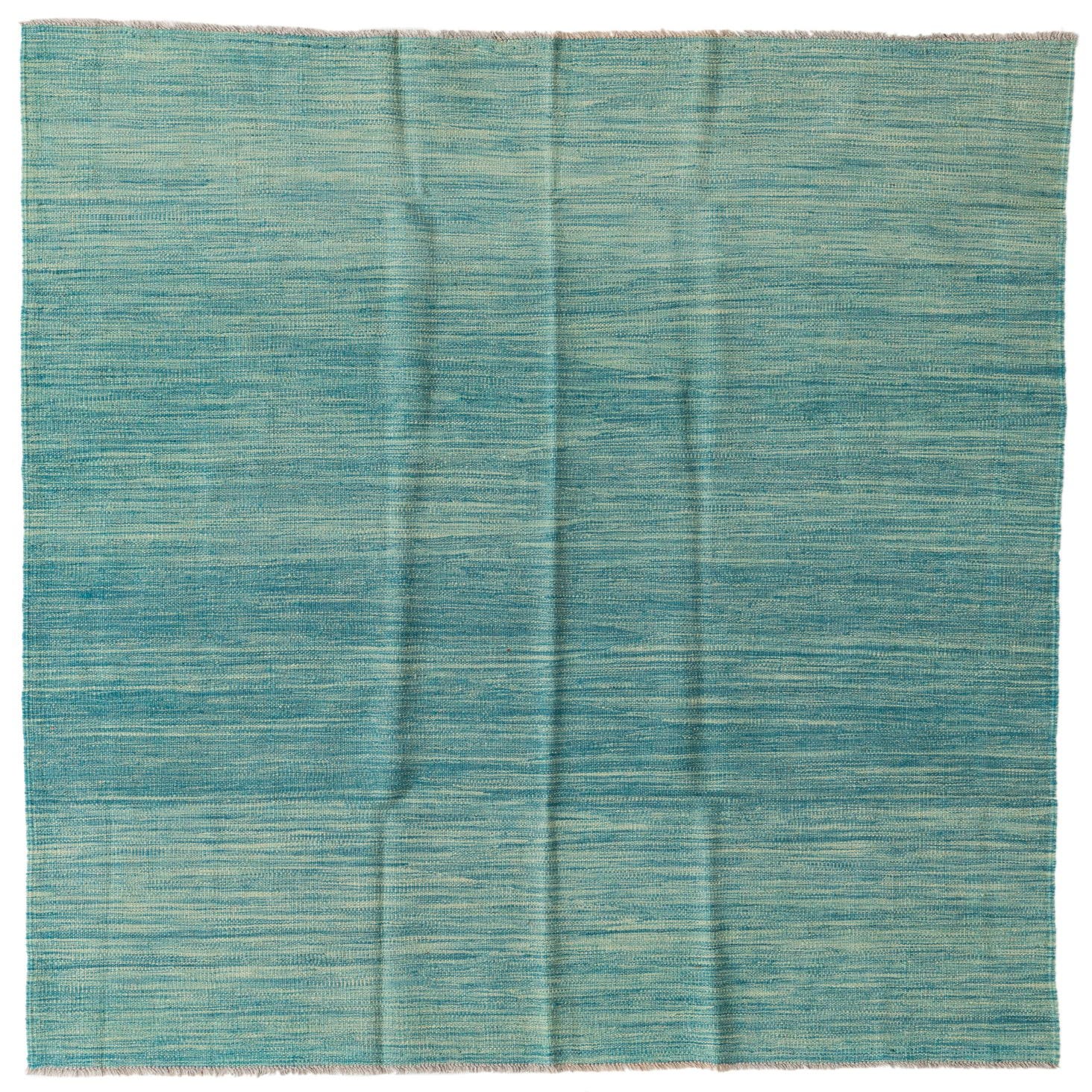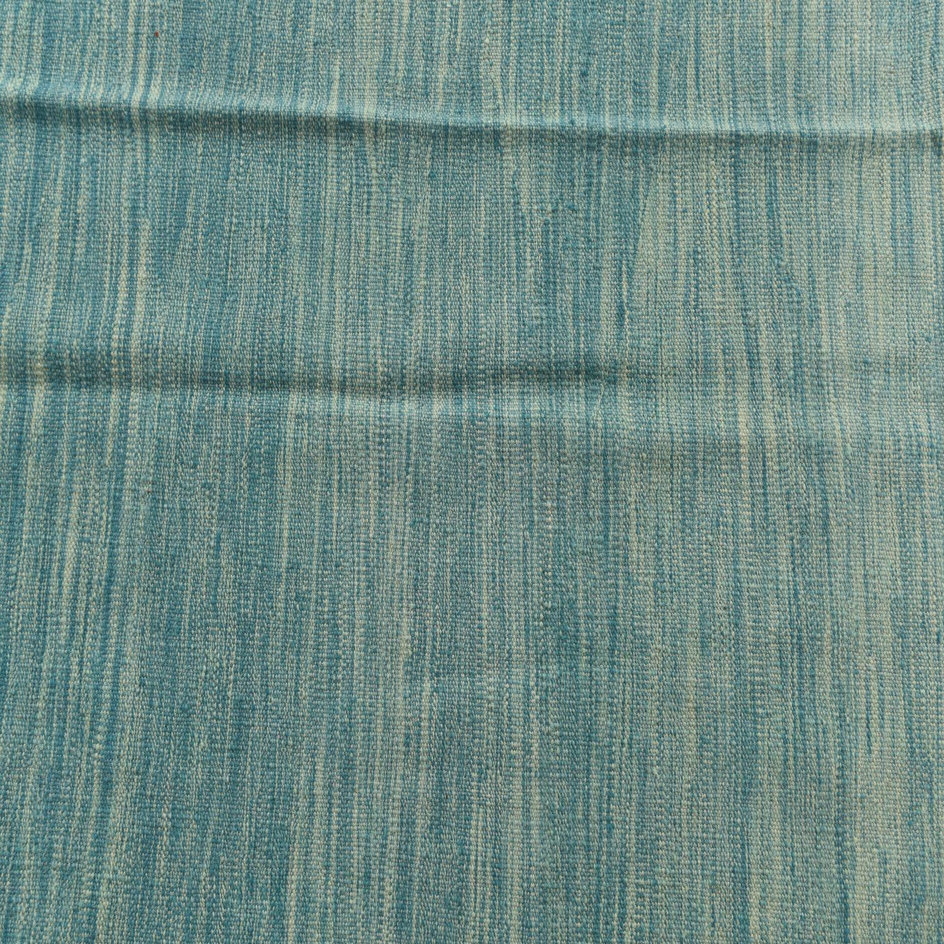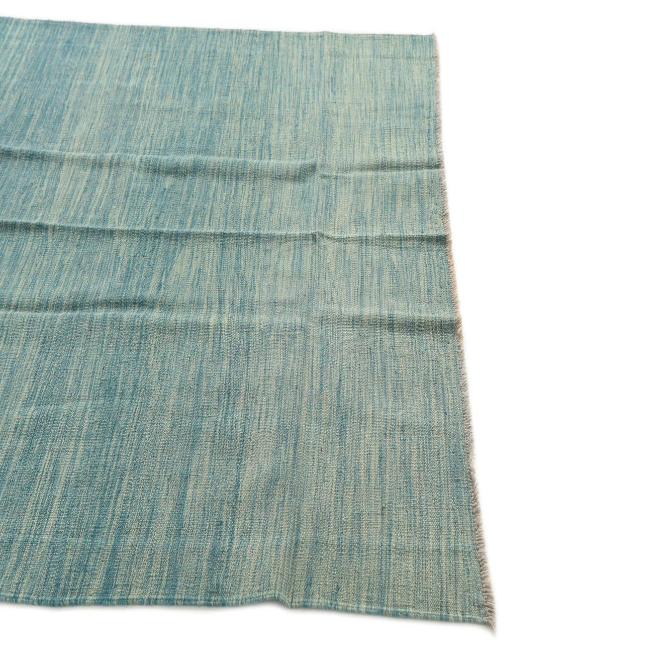 Part of the Kilim Modern collection, this hand-woven 4x6 rug is crafted from 100% wool, showcasing the durability and fine craftsmanship inherent to the Kilim weaving tradition. The rug presents a primarily blue background with subtle beige accentuations woven throughout, creating an understated yet dynamic visual texture.