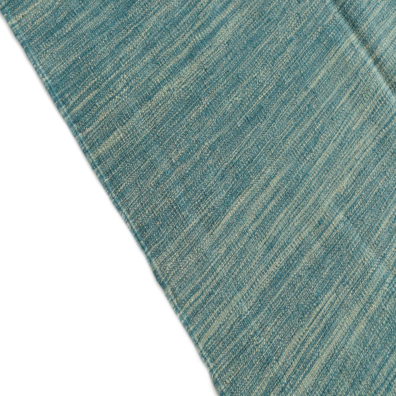 A 4x6 rectangular Kilim Modern wool rug in varying shades of blue, featuring a flatweave texture.