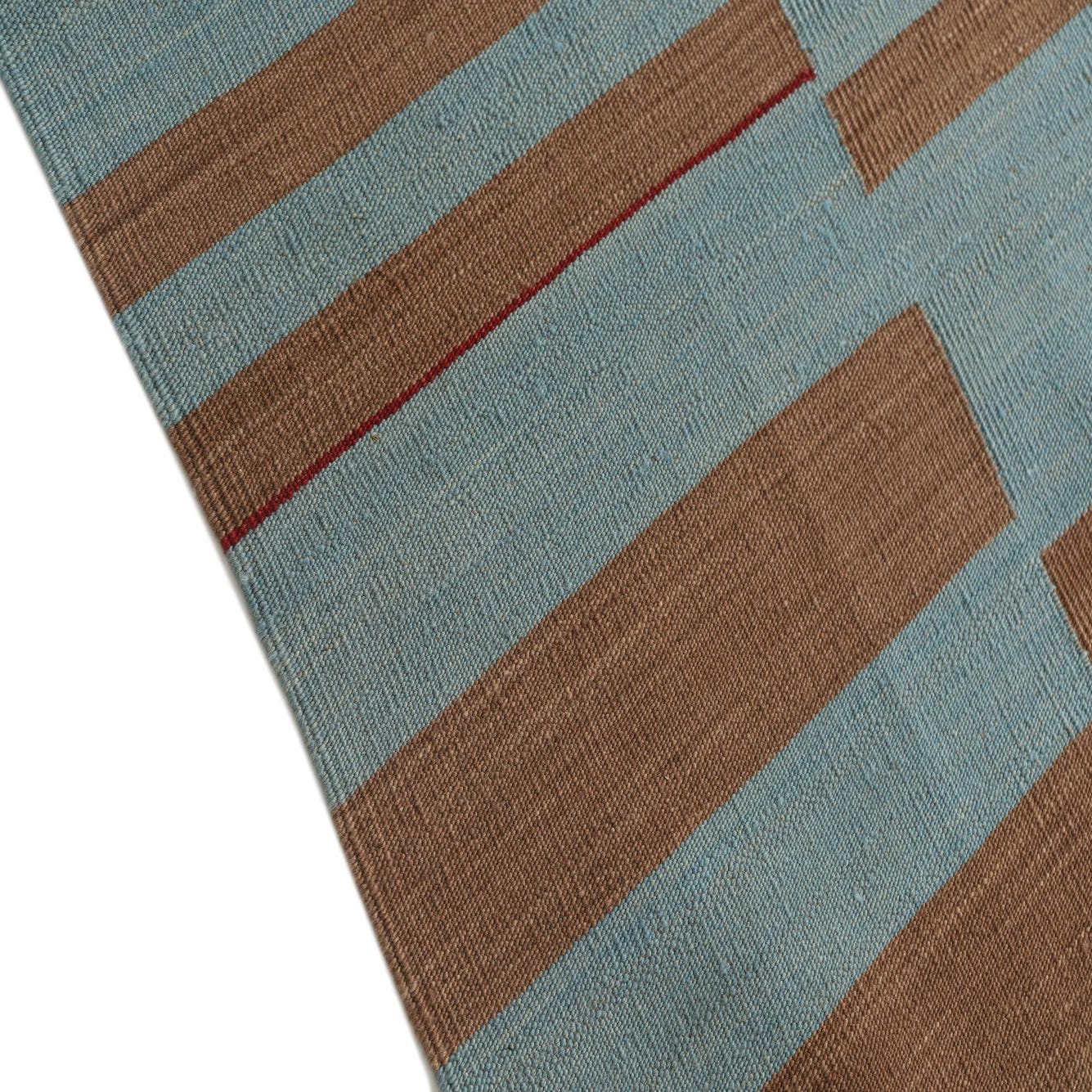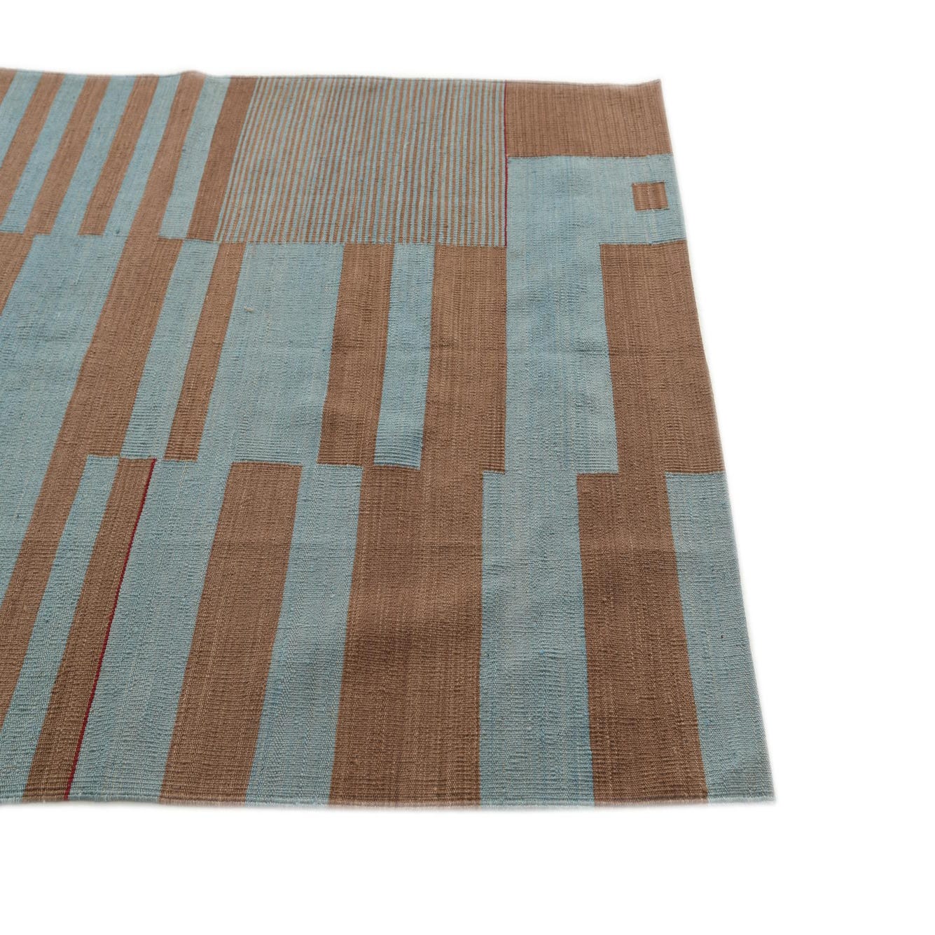 A 4x6 rectangular Kilim Modern rug with a flatweave, featuring an abstract pattern of alternating blue and brown blocks and stripes.