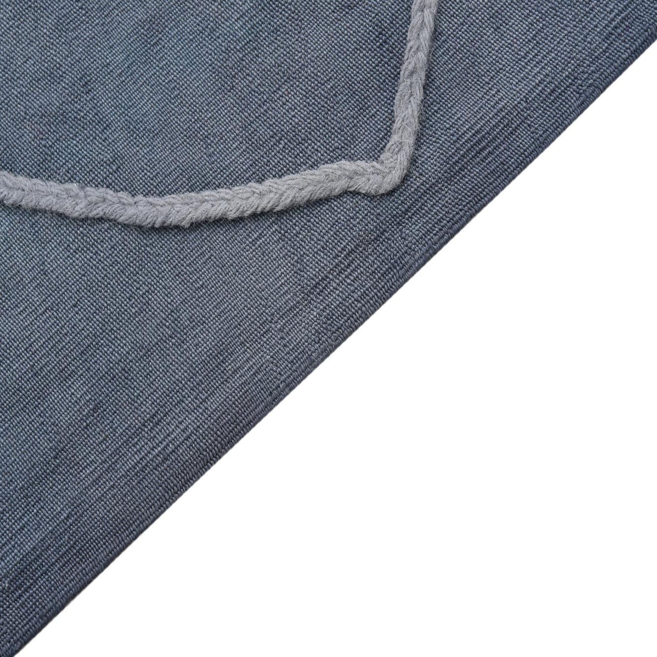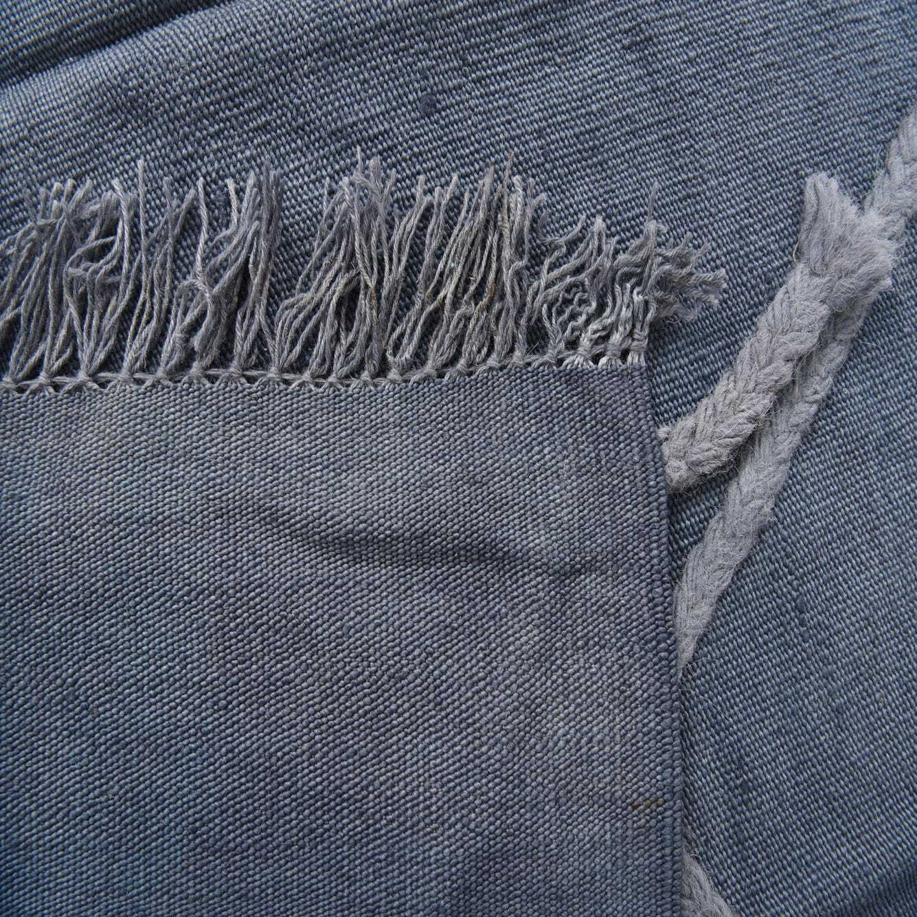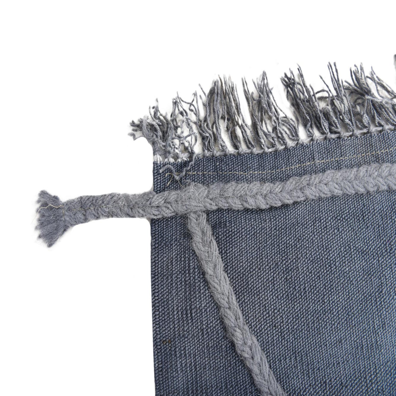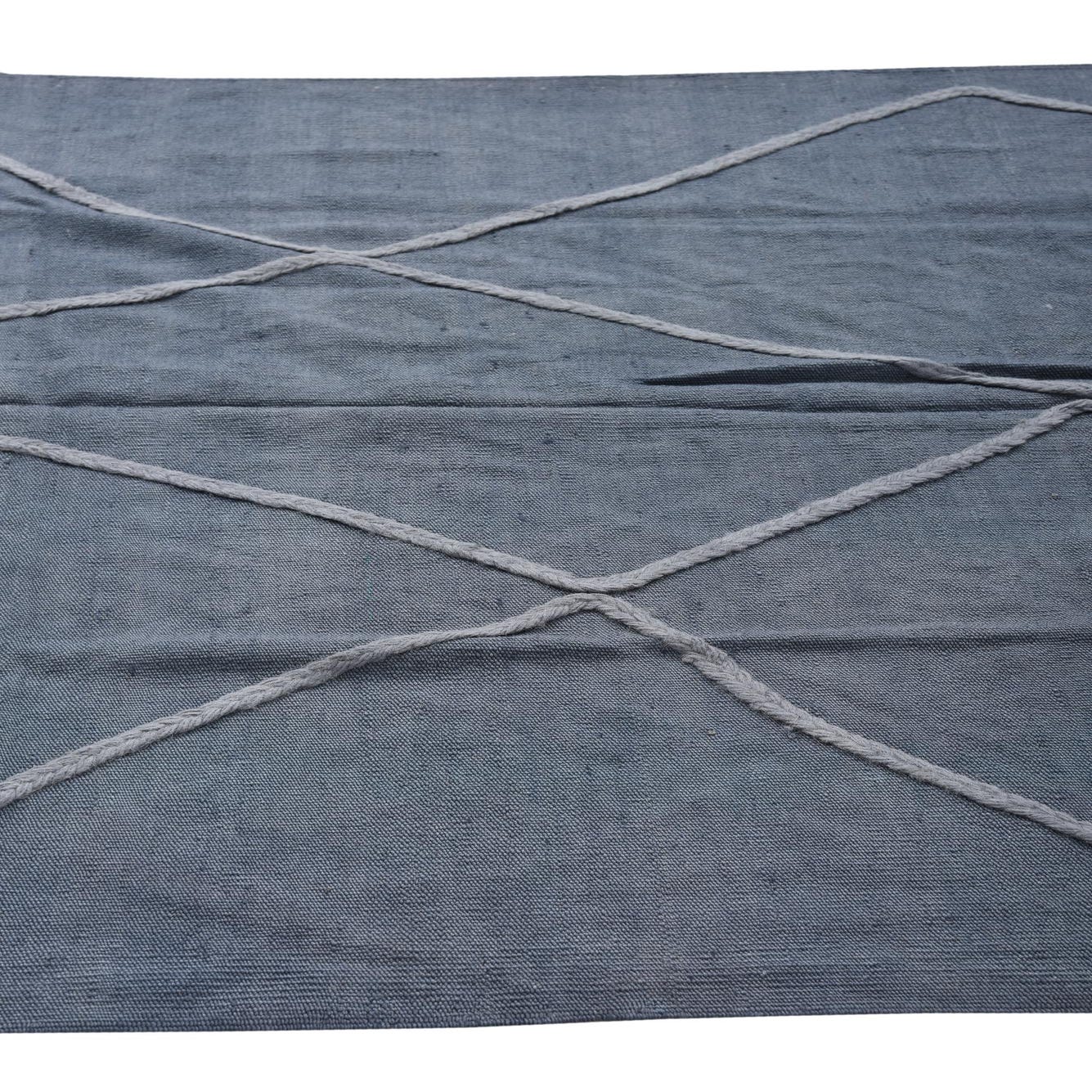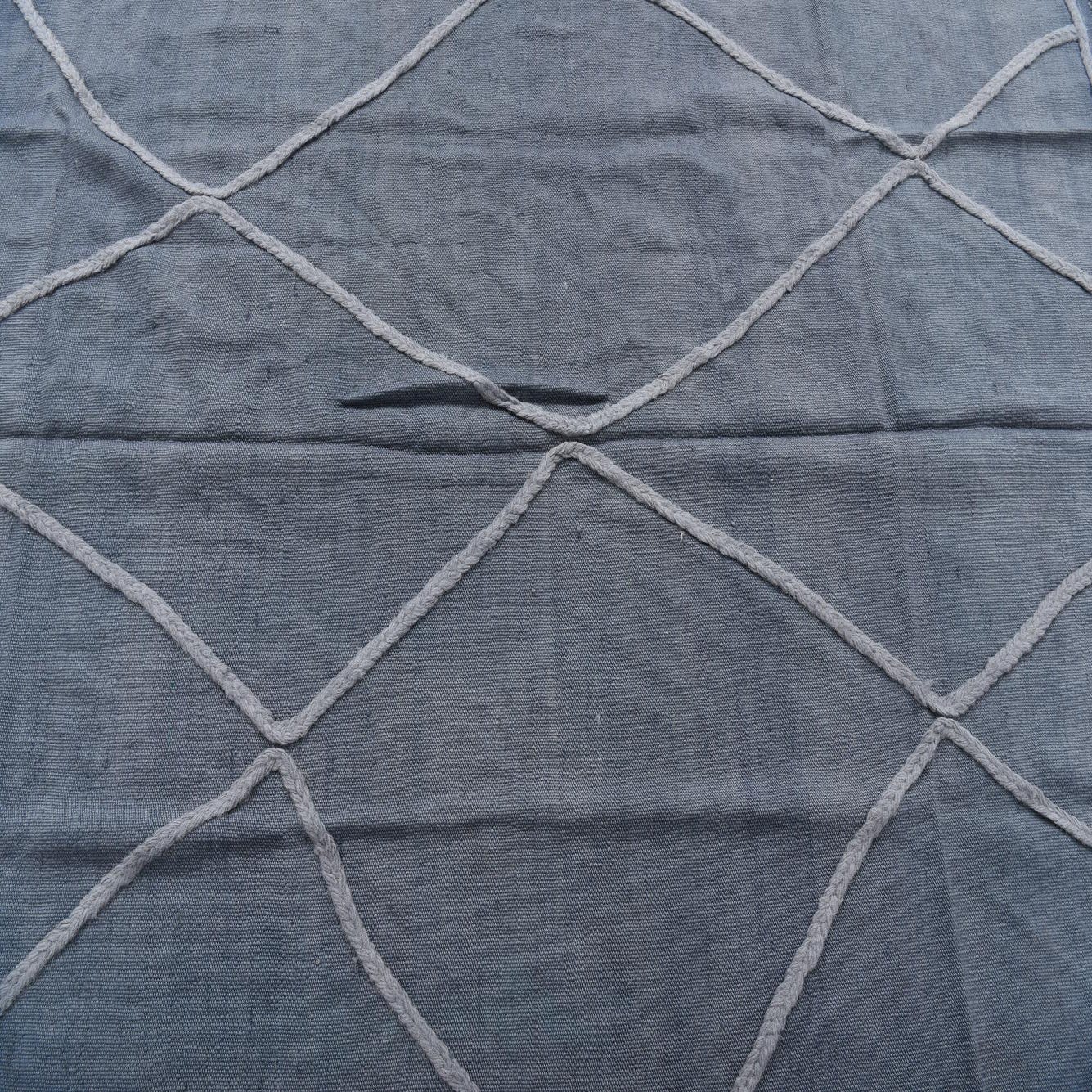 A 4x6 rectangular blue flatweave wool rug with a light grey tribal diamond pattern and fringed edges.