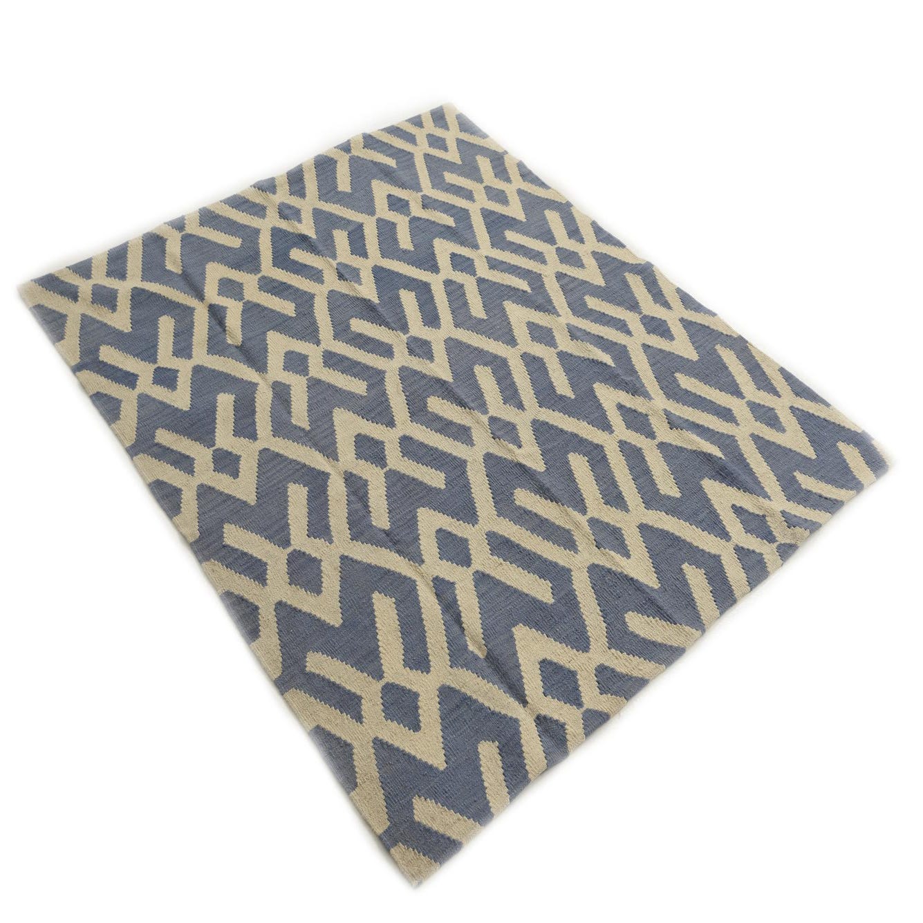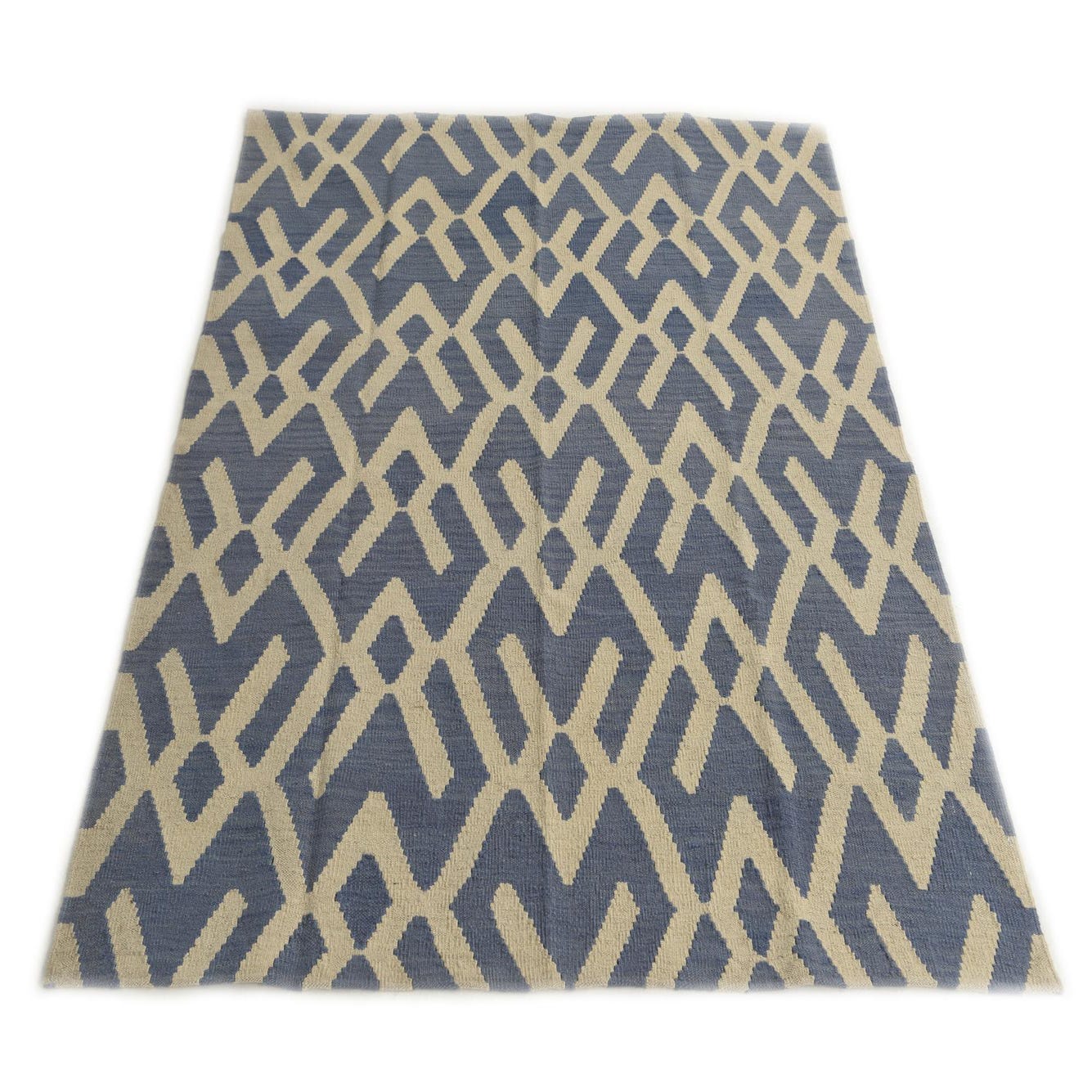 A 4x6 rectangular blue and cream flatweave wool rug with a modern tribal geometric pattern.