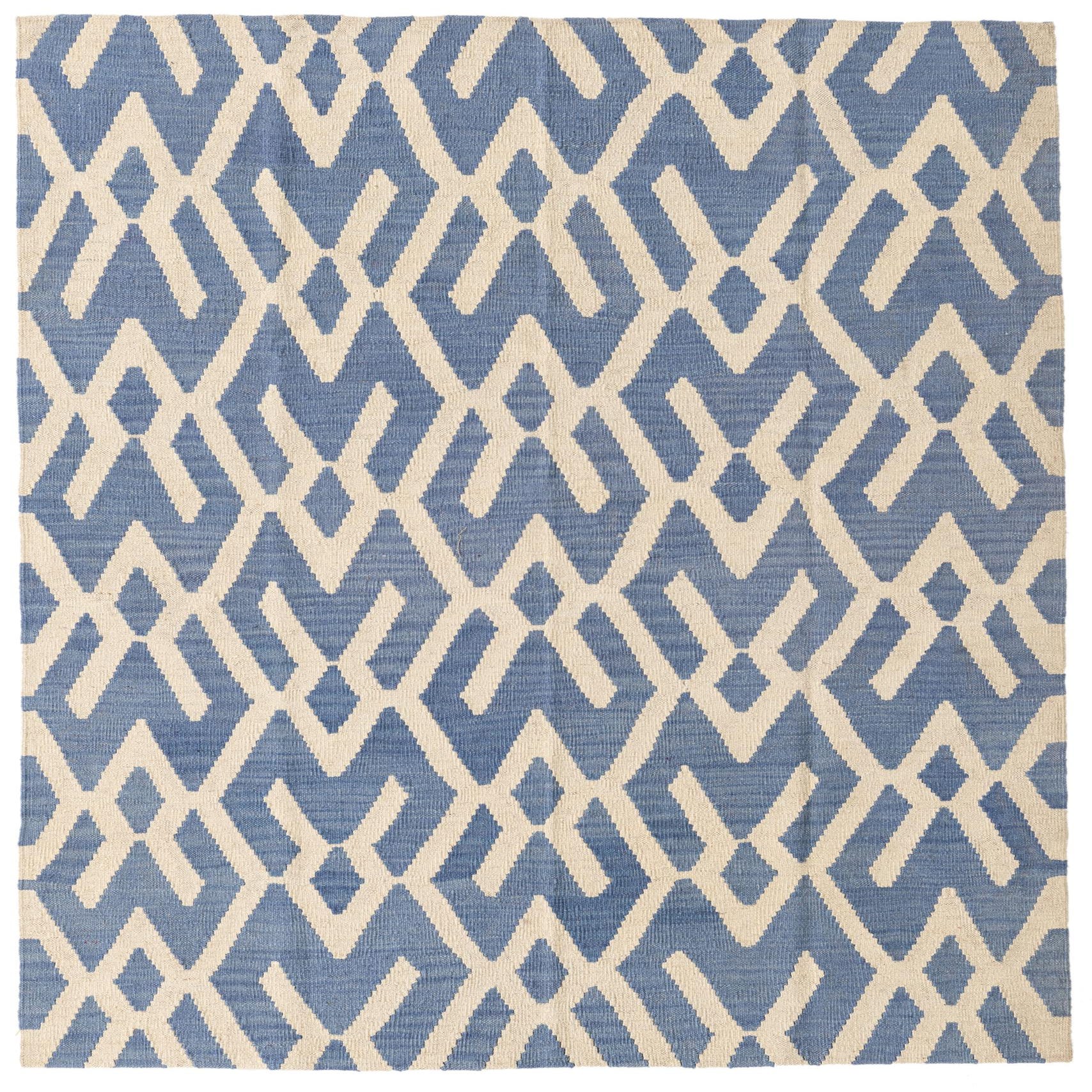 The Kilim Modern collection presents a 4x6 hand-woven rug crafted from 100% wool, offering both durability and comfort underfoot. The rug's design showcases a bold, blue background with an intricate cream pattern, creating a compelling geometric array that lends itself to contemporary aesthetics. The flatweave texture contributes to its sleek profile, making it a versatile addition to spaces that benefit from a touch of visual interest without overwhelming the area.