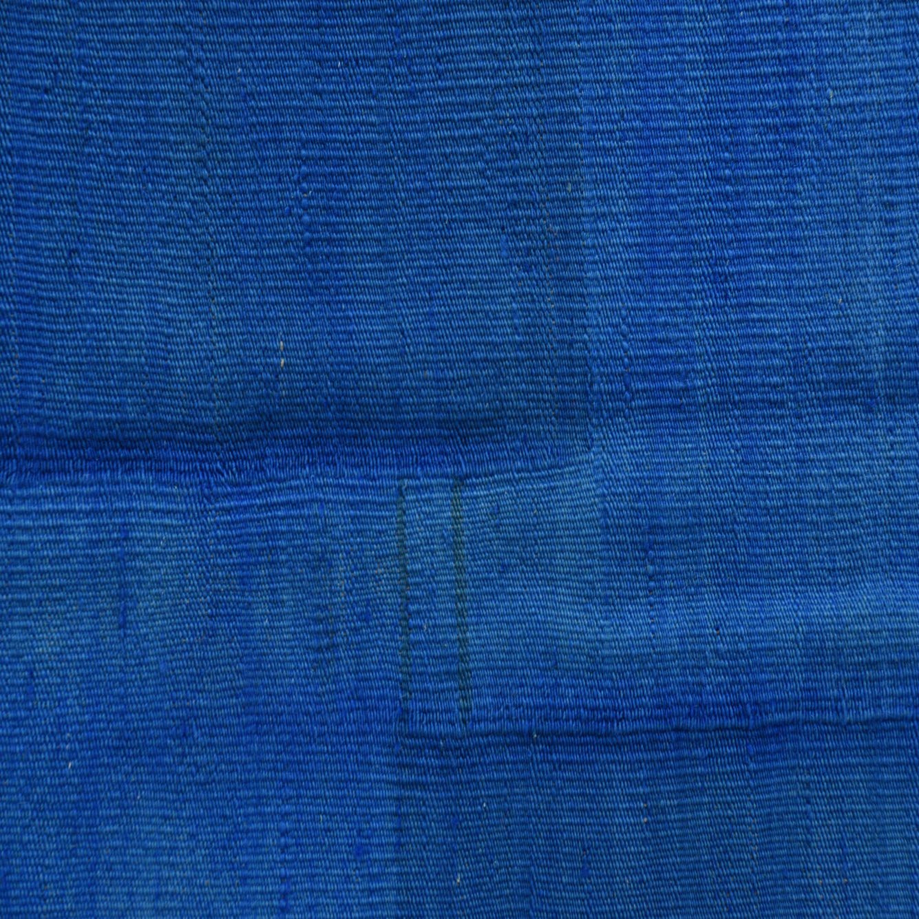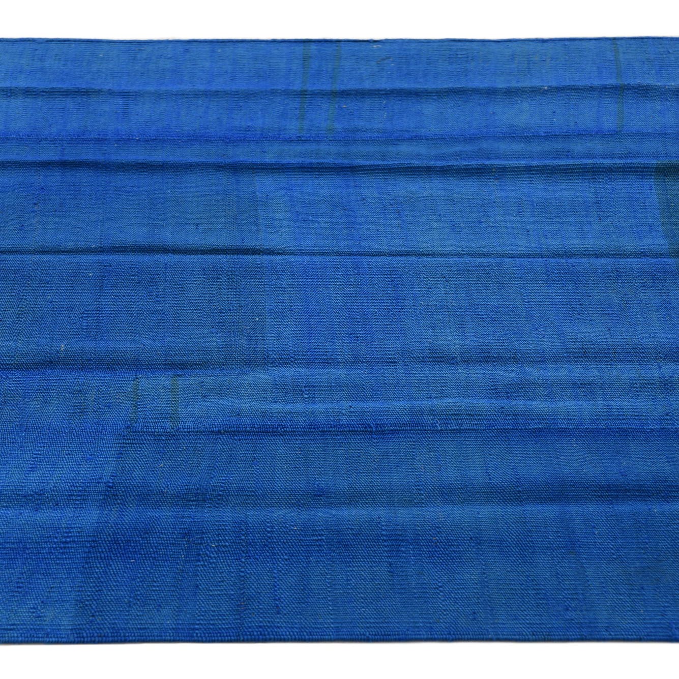 A 4x6 rectangular blue flatweave rug with subtle tonal variations, showcasing a modern tribal pattern.