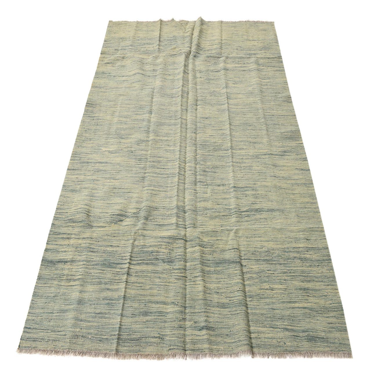 The Kilim Modern collection presents a 4x6 hand-woven rug crafted from 100% wool, offering both durability and a tactile experience underfoot. Its design features a predominantly blue background with subtle ivory accents, imparting a serene and refined aesthetic. The texture and weaving technique used in this rug produce a flatweave construction that is characteristic of traditional kilim rugs, providing a contemporary yet timeless appeal.