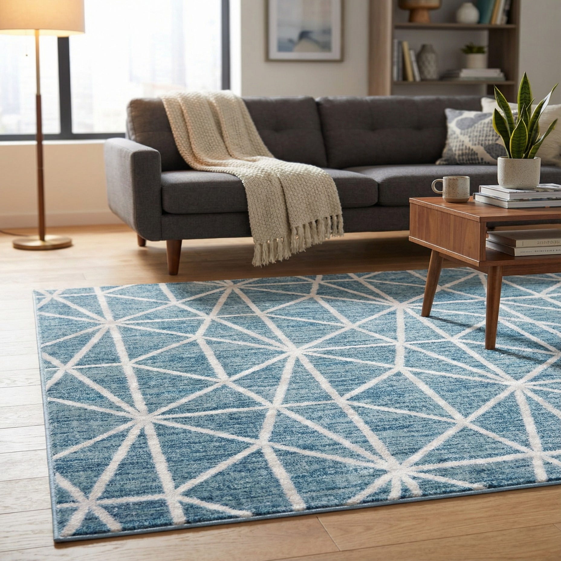 A crisp geometric trellis pattern crosses a rich blue field, where intersecting ivory lines form triangles and starburst intersections that bring structure and movement to the surface. The contrast of cool blue and clean ivory gives the rug a modern, airy look while the slightly raised ivory lines add tactile dimension. Running your hand across it you’ll notice a soft, low-to-medium pile with a subtle sheen that feels comfortable underfoot and highlights the geometric design.