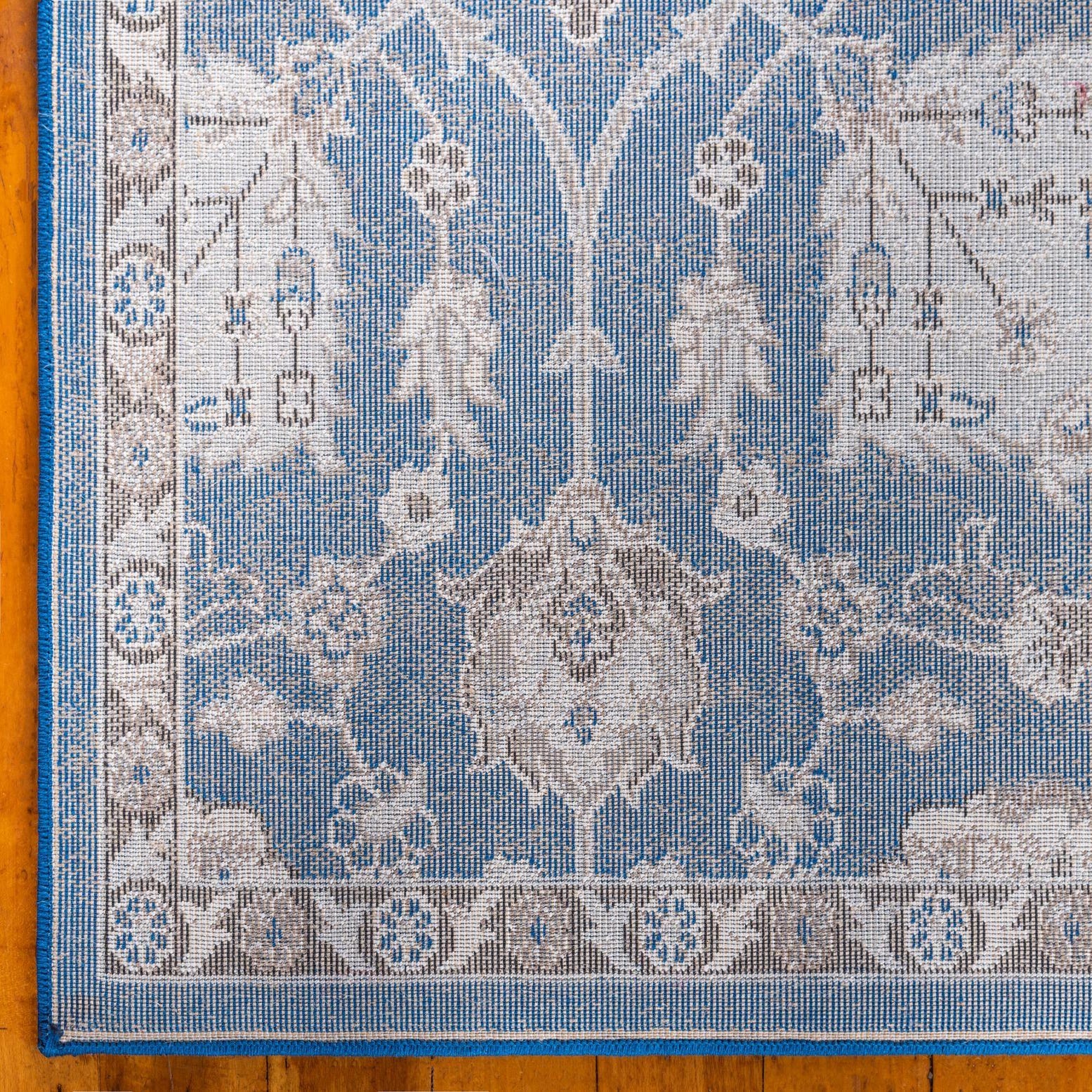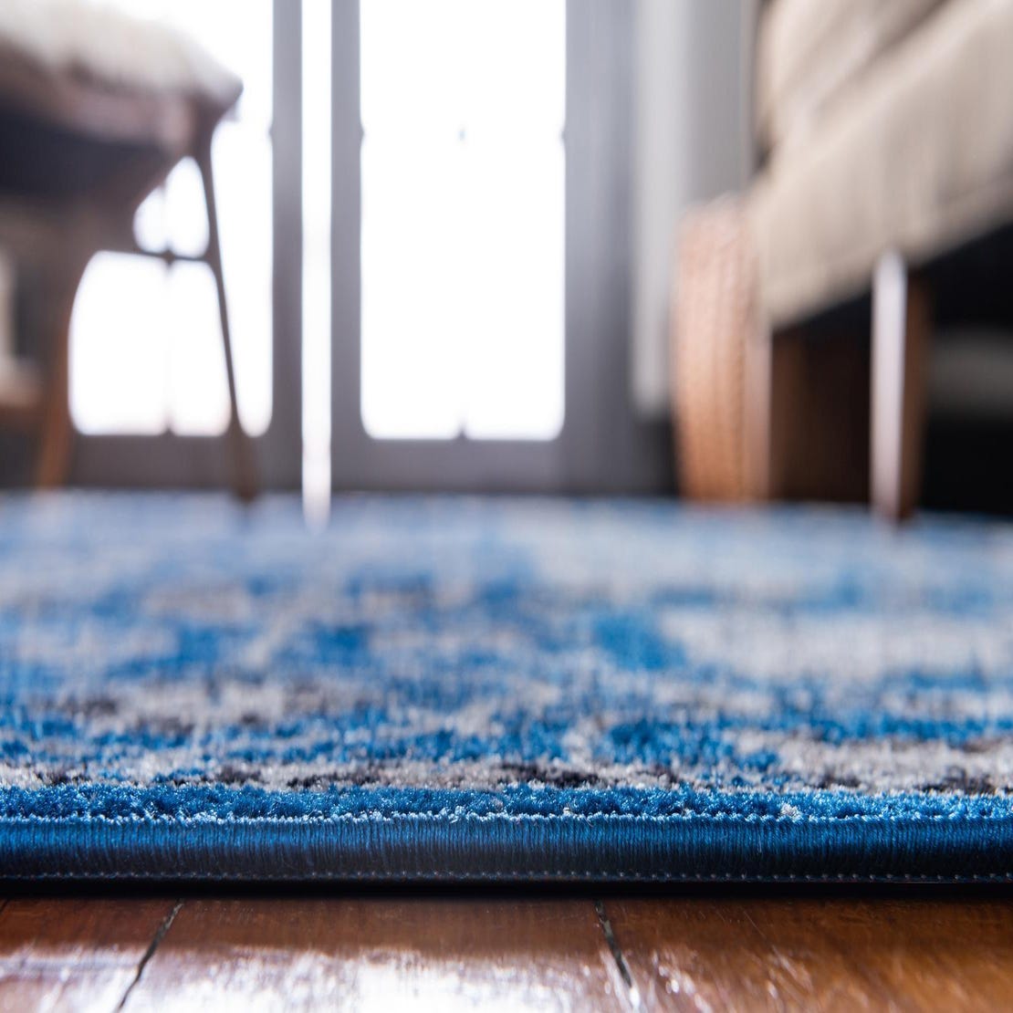 Primary color is Blue. Colors in this rug include: Blue, Black, Gray, Ivory, Silver.
