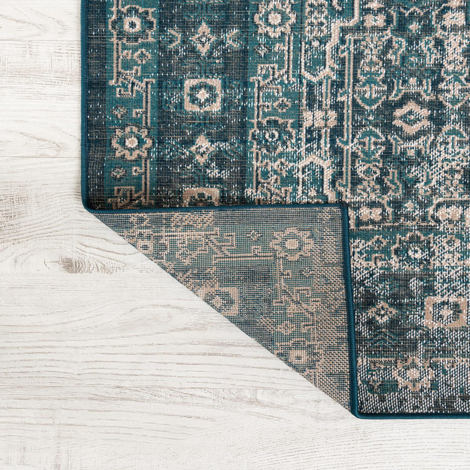 A faded, vintage-inspired medallion pattern sits on a blue background, where layers of ivory, light blue and gray form worn geometric motifs and a detailed border. The overall effect is softly distressed rather than sharply defined, giving the design a relaxed, lived-in character. Run your hand across the surface and you’ll notice a low, tightly woven pile that offers a smooth, slightly dense feel underfoot without a heavy texture.