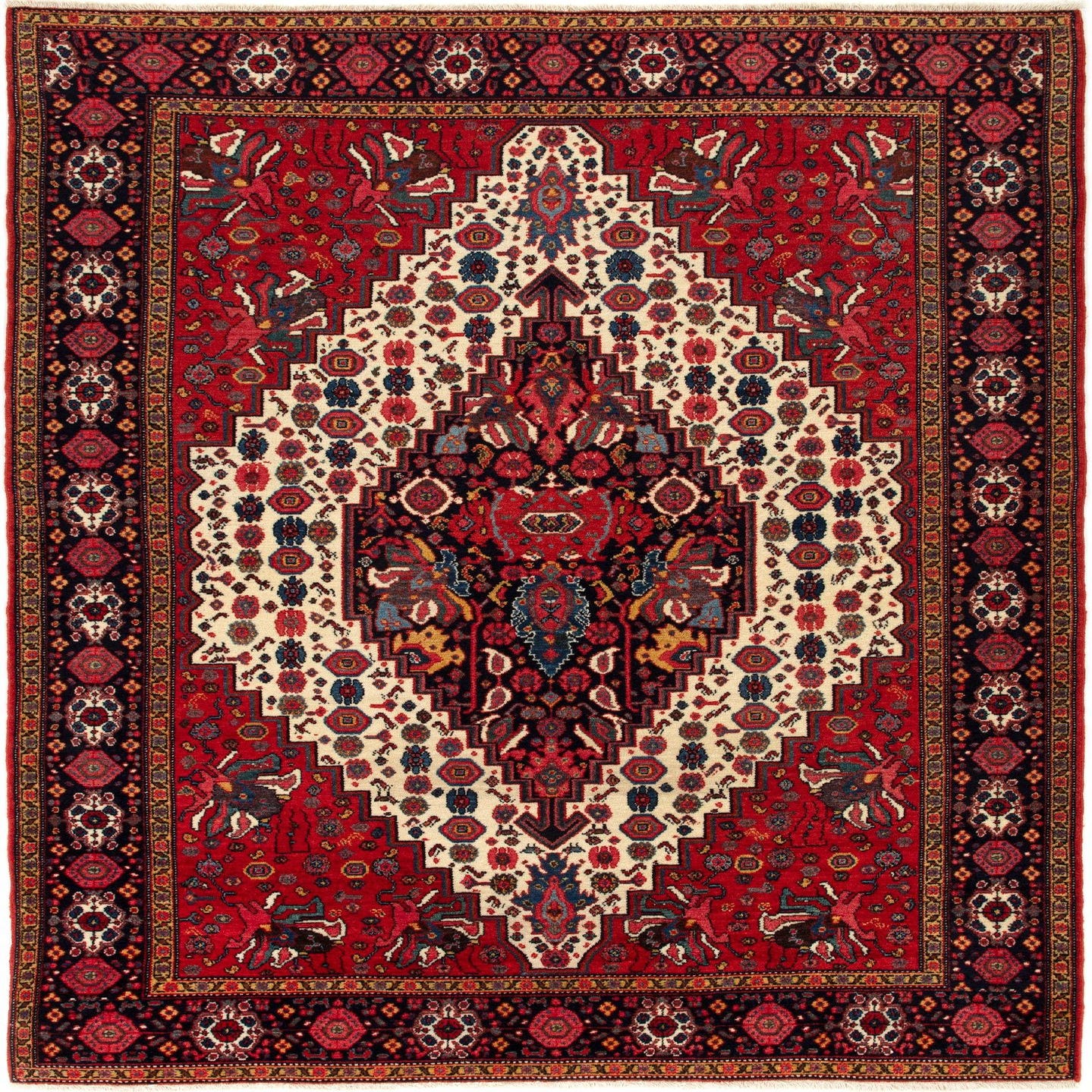 A 4x6 rectangular Malayer Persian rug featuring a central diamond medallion in cream and navy, surrounded by red and a navy border, with intricate tribal patterns.